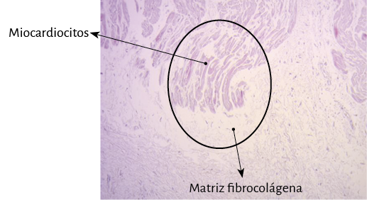 Figura 40. Inserción del miocardio en el fulcro cardíaco (corazón bovino). Técnica de hematoxilina-eosina (15x).