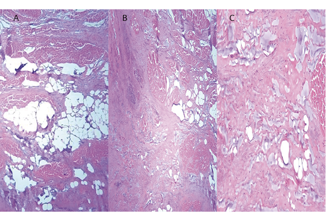 Figura 56. Corazón humano adulto. A: segmento ascendente del miocardio continuo antes de ingresar al fulcro cardíaco. Escaso tejido precondroideo. Se observa tejido adiposo. B: el mismo segmento ingresando al fulcro. Aún escaso tejido precondroideo. C: segmento ascendente en pleno fulcro. Las fibras ya se hallan rodeadas de estroma precondroideo. Técnica de hematoxilina-eosina (15x).