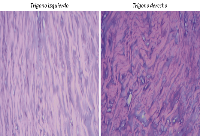Para establecer fielmente la identidad del fulcro cardíaco se ha realizado también análisis histológico sobre los trígonos tratando de hallar cardiomiocitos en ellos, como posibilidad de la inserción del músculo cardíaco en dichas estructuras. En nuestra investigación solo se observó tejido colágeno sin cardiomiocitos en los trígonos, confirmando que el fulcro es el sostén del miocardio, tanto en su inicio como en la terminación (figura 57).