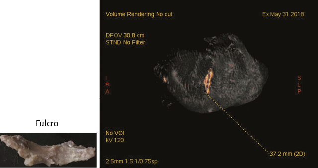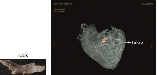 Figura 59. Fulcro cardíaco en tomografía computada (corazón bovino).Al pie se muestra el fulcro resecado.