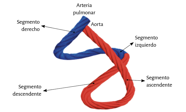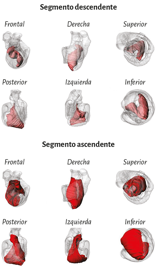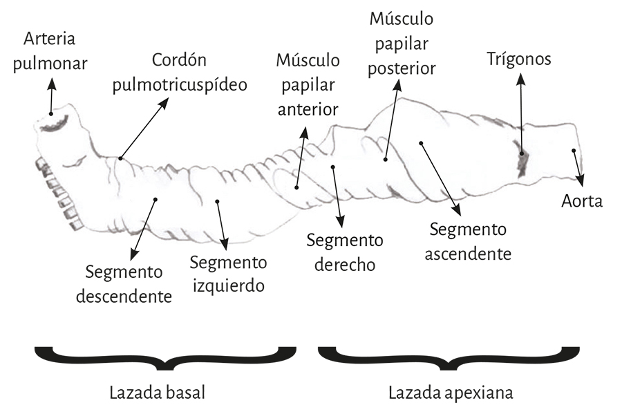 La lazada basal, desde su inserción en el fulcro cardíaco, se extiende hasta el doblez central del miocardio continuo. Por su parte la lazada apexiana discurre desde ese punto de inflexión del miocardio hasta la base aórtica. Cada una de ellas consta a su vez de dos segmentos. La basal está constituida por los segmentos derecho e izquierdo. Los pertenecientes a la apexiana tienen el nombre de descendente y ascendente (figura 7). En la disposición integral de las lazadas, la basal abraza a la apexiana, lo cual determina que la cavidad ventricular derecha se presente como una hendidura abierta en el espesor de la masa muscular que conforma a ambos ventrículos (figura 1). Con relación a los segmentos, ellos están definidos por referencias anatómicas, sin perder la continuidad que ostenta el miocardio en carácter de músculo único.