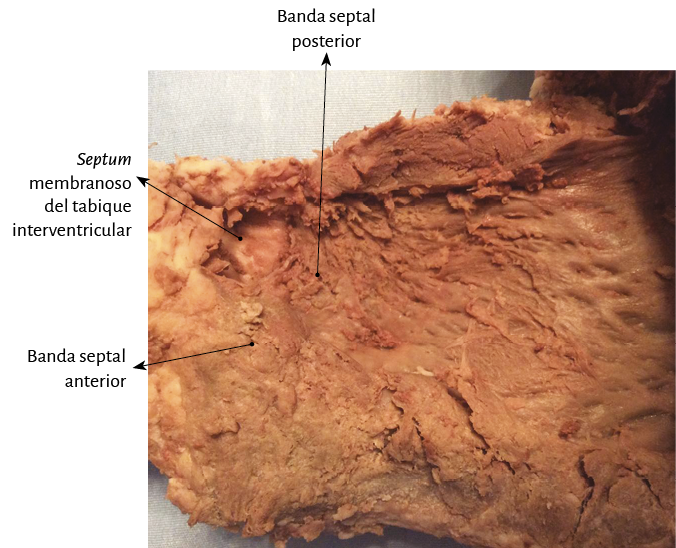 El tabique interventricular consta de una parte ventral y otra dorsal. La primera porción la componen el segmento descendente izquierdo, la banda intraseptal (segmento final de la banda muscular) y la banda septal anterior. Los dos primeros pertenecen al ventrículo izquierdo y el restante, al ventrículo derecho. La región posterior del tabique está compuesta por el segmento descendente izquierdo (dependencia del ventrículo izquierdo) y la banda septal posterior, correspondiente al ventrículo derecho.