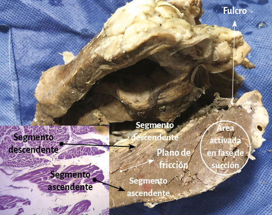 En la figuras 6 y 32 se muestran los segmentos descendente y ascendente diseccionados, observándose las fibras en espiral de acuerdo con la estructura helicoidal. Se advierten en detalle las fibras musculares de los segmentos descendente y ascendente, las cuales se orientan con el fin de lograr el efecto mecánico de torsión ventricular, a través de su dirección espiralada (199). Las fibras del segmento descendente en la cara anterior del ventrículo izquierdo transcurren en profundidad por el mesocardio cruzándose oblicuamente y en posición interna con las del segmento ascendente (figura 66), de ubicación externa. Para una síntesis de los fascículos que componen el miocardio continuo pueden observarse la figura 70 y el cuadro 1.