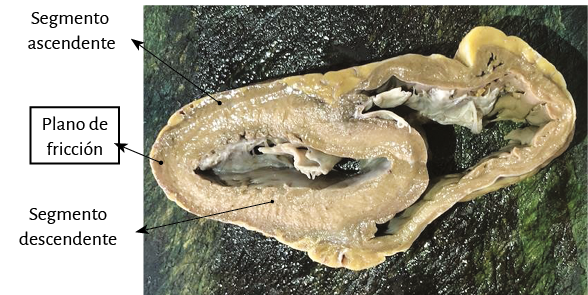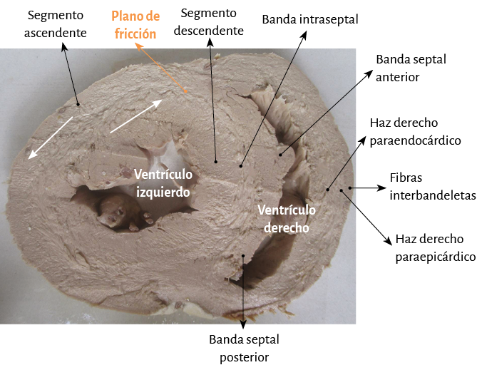 Figura 67. Sección transversa de los ventrículo derecho e izquierdo (corazón humano). Se muestra el plano de fricción entre los segmentos ascendente y descendente.