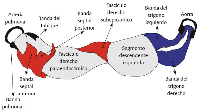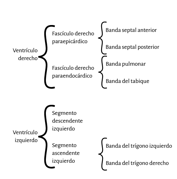 De estos conceptos se deduce que el ventrículo derecho está constituido por una sola lazada (basal) y el ventrículo izquierdo por las dos (basal y apexiana). Además, la pared libre del ventrículo derecho está formada por un solo segmento (segmento derecho), mientras que la pared libre del ventrículo izquierdo se halla constituida fundamentalmente por dos segmentos con una aposición del ascendente (externo) cubriendo al descendente (interno). En relación al segmento izquierdo, lo hallamos formando la parte posterior del ventrículo izquierdo delimitando el orificio mitral. Su porción inferior se halla cubierta por el segmento ascendente.