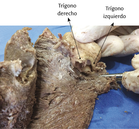 La figura 71 permite distinguir a los trígonos en la raíz de la aorta. Al retirar la valva septal de la mitral, que se halla ubicada entre ambos trígonos, se observa en detalle los trígonos derecho e izquierdo, de carácter fibroso. En cambio, la valva posterior de la mitral se considera una extensión del endocardio ventricular. Sobre la cara anterior de la aorta y por debajo se halla el fulcro cardíaco.