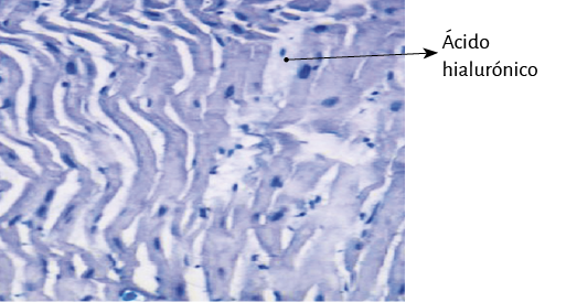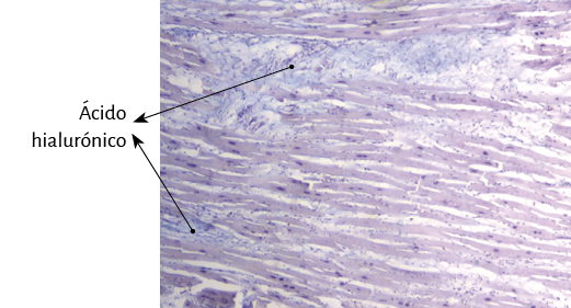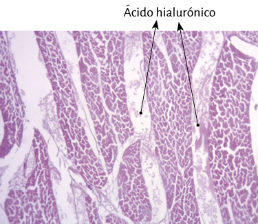 Aparecido en los primeros animales cordados, el ácido hialurónico es abundante en los tejidos conectivos (93). La mitad del ácido hialurónico se encuentra en la piel y el 25% en los huesos y articulaciones. Debido a su capacidad para unir agua es un excelente lubricante y aporta una gran resistencia a presiones mecánicas (68). Ayuda a crear la trama de la matriz extracelular mediante sus interacciones con los proteoglicanos o el colágeno. Cuando está muy concentrado puede interaccionar consigo mismo creando mallas o entramados que le aportan al tejido propiedades viscoelásticas. Durante el desarrollo ayuda a la morfogénesis de estructuras embrionarias. Por ejemplo, se puede liberar desde la parte basal de los epitelios y producir la curvatura en estos, debido a la gran cantidad de agua que atrae (11).