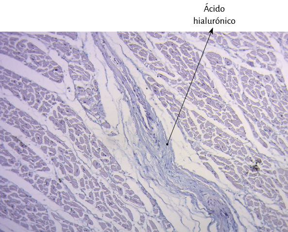 Figura 78. Miocardiocitos embebidos o rodeados por plasma con tinción positiva para Alcian Blue que indica ácido hialurónico (15x) (corazón bovino).