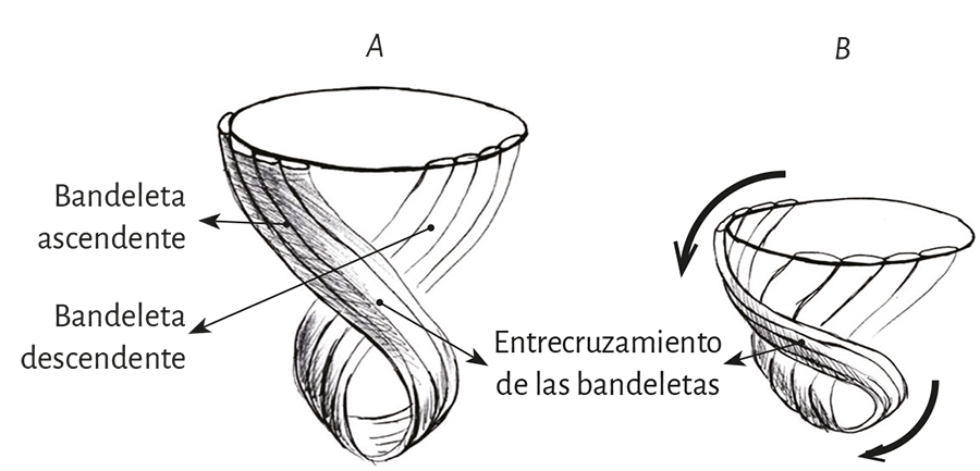 En su trayecto el miocardio toma una disposición helicoidal conformando las dos cámaras ventriculares (79). Esta hélice anatomofuncional se halla constituida por dos bandeletas denominadas descendente y ascendente. La primera incluye los segmentos derecho, izquierdo y descendente, mientras que la segunda queda conformada por el segmento restante, el ascendente (figura 7). La imagen en 8 determinada por este recorrido permite distinguir dos lazadas denominadas basal y apexiana. Resulta interesante que este concepto, representado con el número 8, se halla publicado desde 1923 por R. F. Shaner (153).