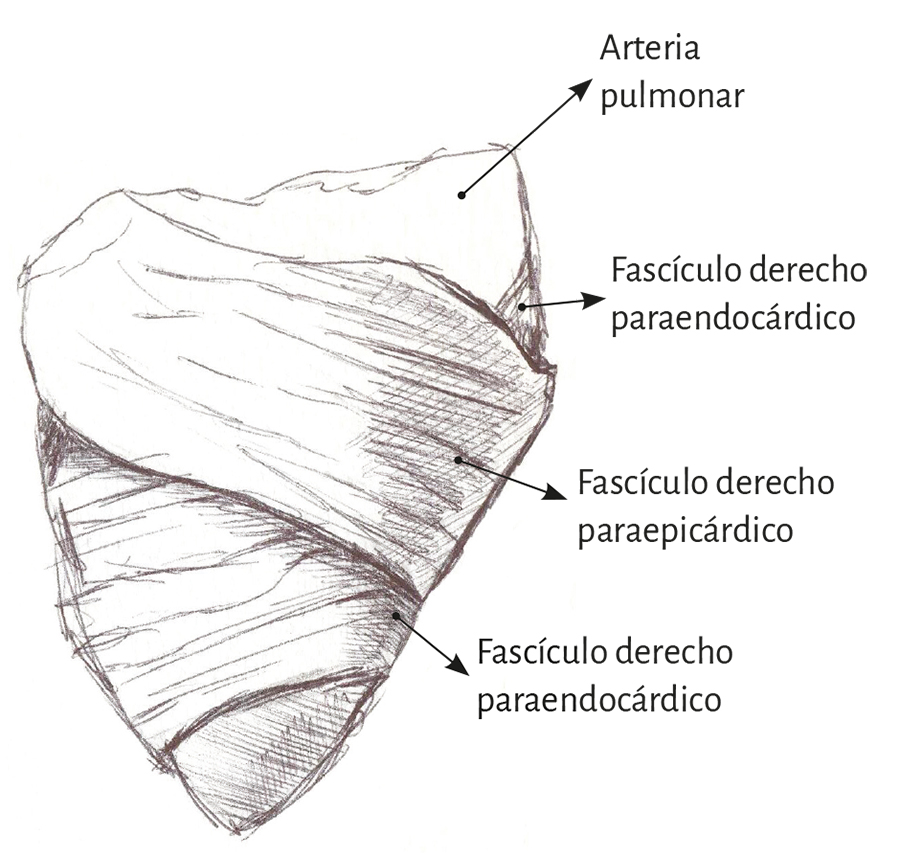 Ventrículo derecho. La pared se halla constituida por dos contingentes de fibras musculares (figura 16) que se cruzan en su trayecto en equis. Uno es el fascículo derecho paraepicárdico que, procedente del surco interventricular posterior, desciende hacia el ápex. El segundo es el fascículo derecho paraendocárdico que, desde la base de la arteria pulmonar, se extiende hasta el surco interventricular posterior. Entre ambos haces se detallan otras fibras intermedias que van sesgando su dirección gradualmente de acuerdo con el plan espiralado del miocardio en su integridad funcional.