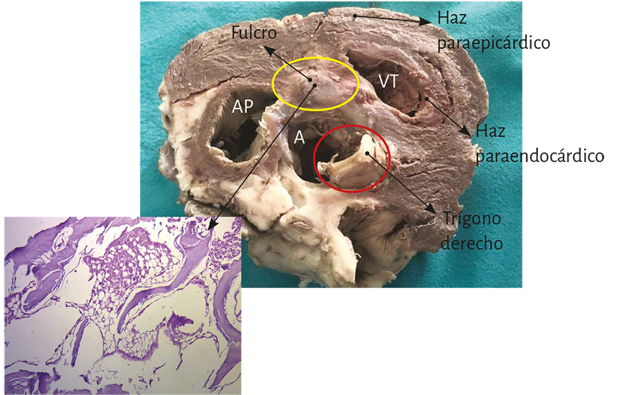 Figura 17. Fotografía aclaratoria de los haces musculares paraepicárdico y paraendocárdico del segmento derecho que forma el ventrículo derecho, los que emergen del fulcro cardíaco. AP: arteria pulmonar. A: aorta. VT: válvula tricúspide. Se observa en el ángulo la histología del fulcro constituida por trabécula ósea madura (corte transversal de un corazón bovino).
