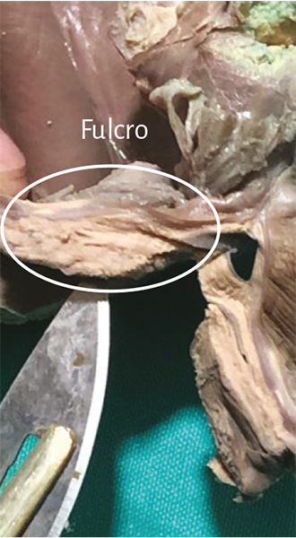 Este sitio de inserción que hemos denominado fulcro cardíaco se encuentra en las proximidades de la válvula tricúspide (derecha), de la aorta (superior) y del cordón pulmotricuspídeo (anterior) (figuras 30 y 31). Para poder hallarlo es necesario desplazar hacia la izquierda del observador la arteria pulmonar y el segmento derecho, desnudando la raíz de la aorta. Este gesto descubre al fulcro por debajo de la aorta e inferior al trígono derecho, sin ninguna continuidad con este, por debajo del nacimiento de la arteria coronaria derecha, desprendido de la continuidad aórtica y ubicado como un elemento complementario entre aorta y miocardio (figura 21).