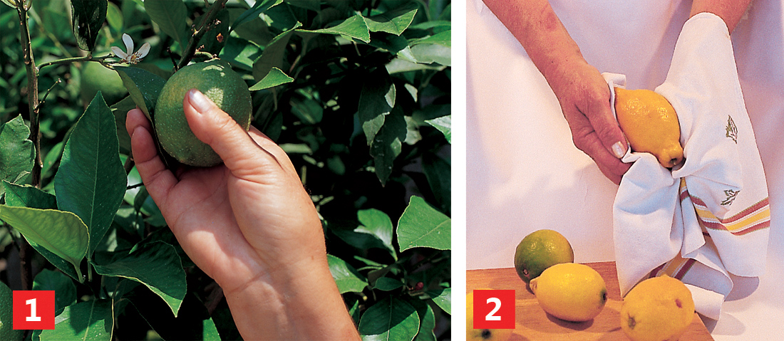 1. Se procede a la recolección de los limones cultivados en una maceta, cultivo posible tanto en el jardín como en el balcón; 2. Después de lavar perfectamente los limones, se secan con cuidado