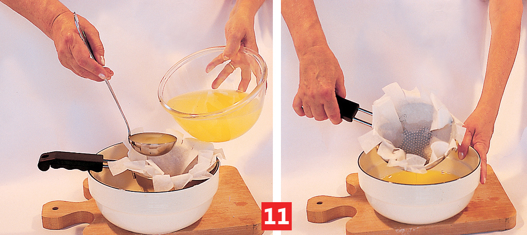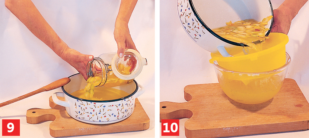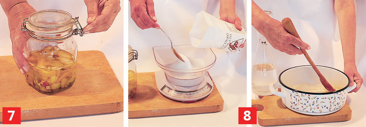9. Se mezcla la infusión con alcohol con el almíbar de azúcar; 10. Se cuela la preparación para eliminar las cortezas de limón