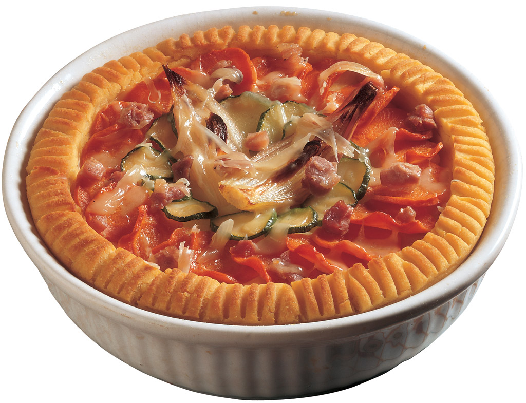 Según algunos estudiosos, el término pizza deriva del latín pinsare (reducir a polvo) o pinsere (pisar, moler), o también de picea, nombre dado al pan de masa de harina de escanda. Otros, en cambio, opinan que pizza proviene del griego plaxa (una especie de hogaza muy baja). En la Edad Media el vocablo se transformó en piza, y posteriormente en pizza, haciendo referencia a un tipo de pan aplastado. Sea como fuere, el origen de la pizza, tal como se la conoce actualmente, con mozzarella y tomate, es muy reciente. De hecho, no es hasta el siglo xix que el tomate se convierte en un ingrediente típico de la cocina napolitana, en donde amalgama a la perfección con un queso de textura especial obtenido de la leche de búfala, la mozzarella. En 1889, la pizza se consagra como plato nacional italiano con el nacimiento de la celebérrima pizza Margarita, creada por el pizzero Raffaele Esposito en honor a la reina de Italia y adornada con los colores de la bandera nacional. A partir de ese momento, el éxito y la difusión de la pizza, que los emigrantes transmitieron a muchos países, no paró de crecer.