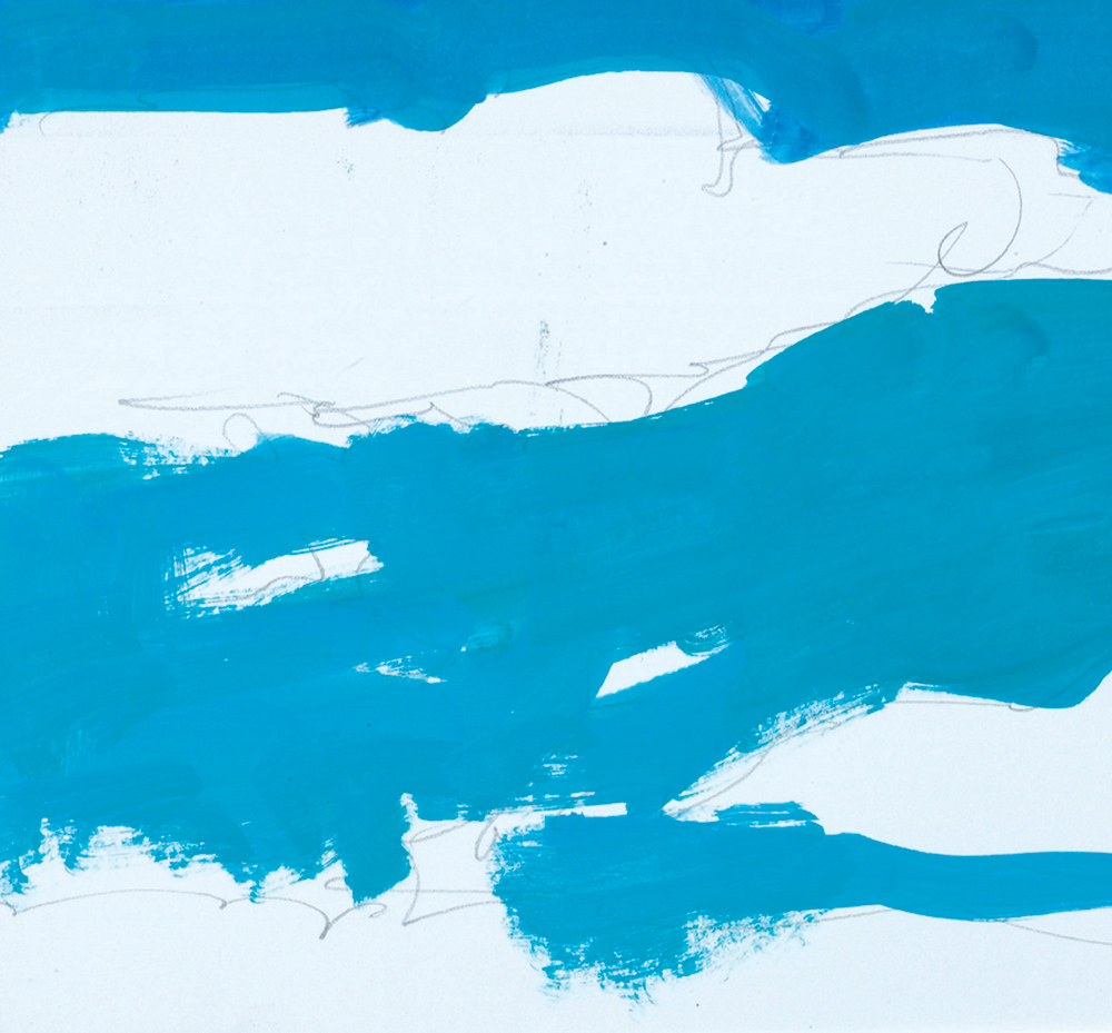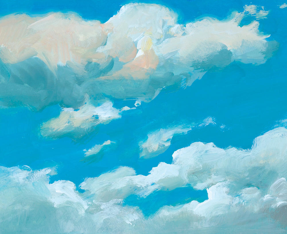 Dibujar la forma de unas nubes puede ser un buen ejercicio para familiarizarse con el procedimiento de cualquier técnica pictórica. Se coge color azul claro de la paleta y se mancha todo el fondo, dejando reservadas, o sea, sin pintar, las partes destinadas a las nubes. La pintura se seca rápidamente, pero si, una vez pintada, se vuelve a humedecer, se podrá rehacer la zona manchada. A los pocos minutos la superficie del papel ya se habrá secado.