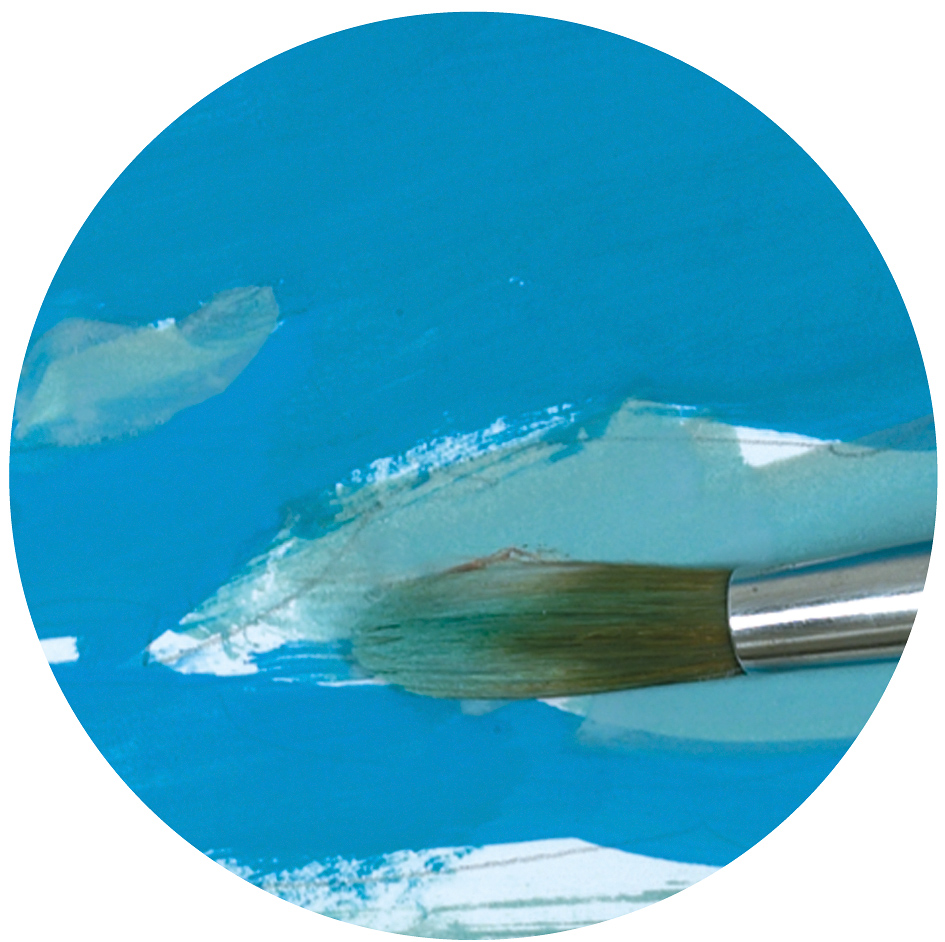 1. Se efectúa una variación de color con azul, verde y un poco de blanco. Con esta mezcla se obtiene una tonalidad ligeramente agrisada que servirá para manchar las zonas más oscuras. La pincelada se mancha bastante plana, dejando tras su arrastre una parte cubierta. De momento no se mancha la zona iluminada.