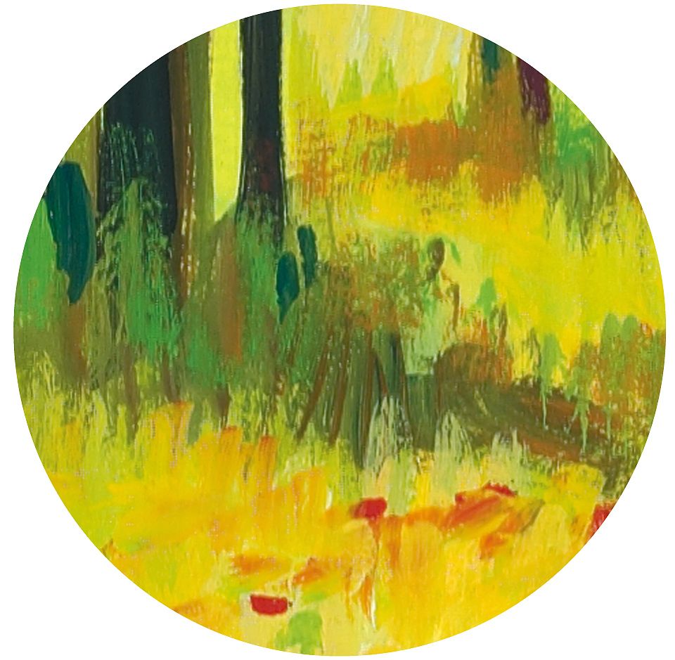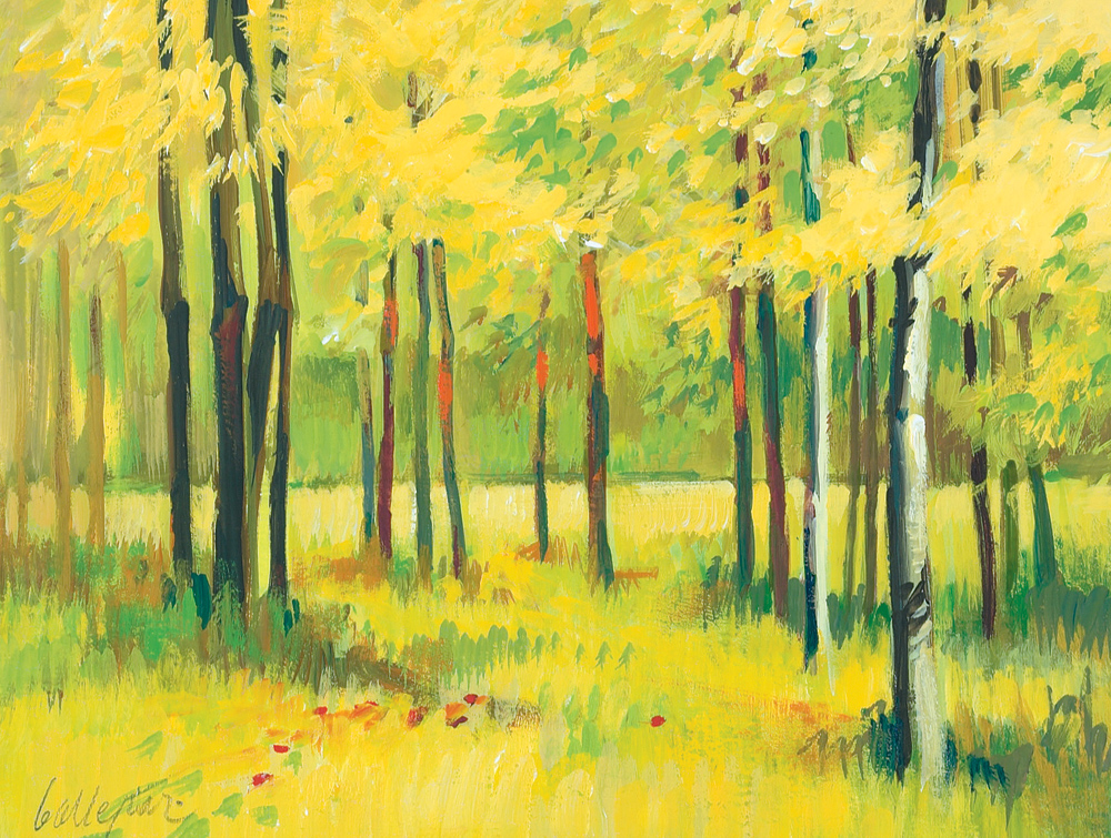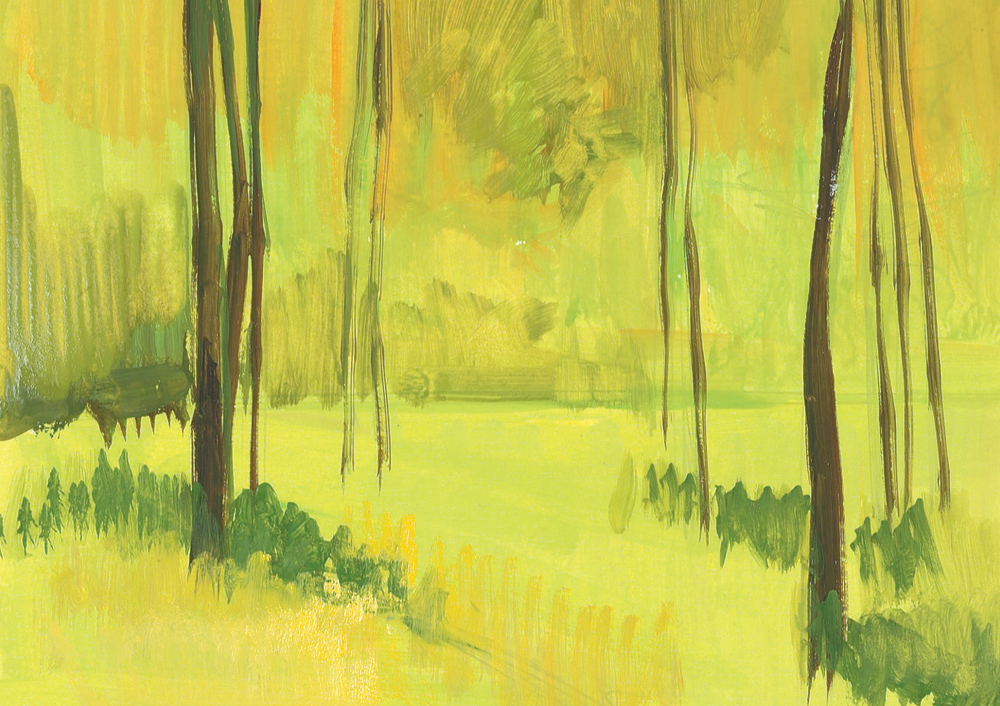 3. Los colores del fondo son los primeros que se pintan. Las diversas tonalidades verdosas permiten insinuar toda la frondosidad más distante. Con diversos trazados verticales se mancha la hierba del primer término, sin llegar a cubrir la base amarillenta en su totalidad. Con negro y pardo se manchan los troncos de los árboles y sobre estos se pintan superpuestas las partes más luminosas. Por último, con tonos luminosos de amarillo y verde se pinta la hojarasca del primer término. Los colores se superponen con gran facilidad.