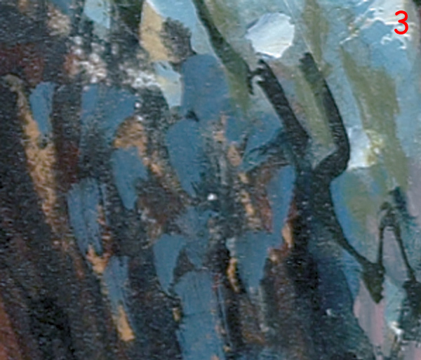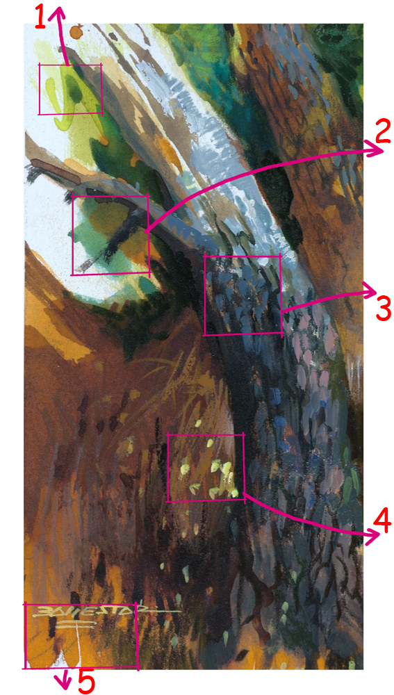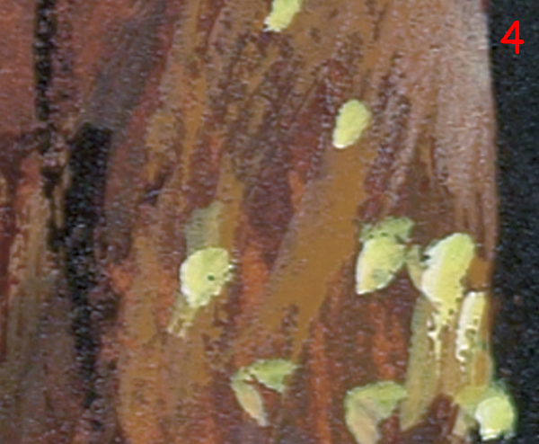 3. Las pequeñas manchas no son más que pinceladas sueltas que se encargan de insinuar la textura de la corteza del árbol. |