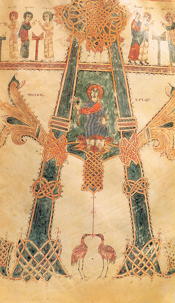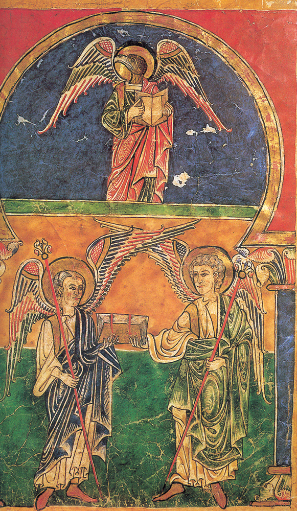Antes de que se utilizara el papel, los artistas trabajaban sobre pergamino, retales de piel de cordero curtida y afinada hasta que adquiría un mínimo grosor. En la Edad Media la cultura quedó relegada a los conventos, y en ellos los copistas y miniaturistas elaboraban obras tan magníficas como esta página, que muestra la presentación del evangelio de San Juan por dos ángeles. En la parte superior destaca el símbolo antropomórfico del evangelista. La técnica pictórica está aquí desarrollada con un gran sentido del color y del detalle. Los colores planos, sin valoración, contrastan fuertemente entre ellos. Cabe destacar la imitación de los dorados en diversas zonas del enmarcado y en las aureolas de los personajes. En algunas zonas se dejó sin pintar el pergamino, y el color claro se integra entre los brillantes colores del temple.