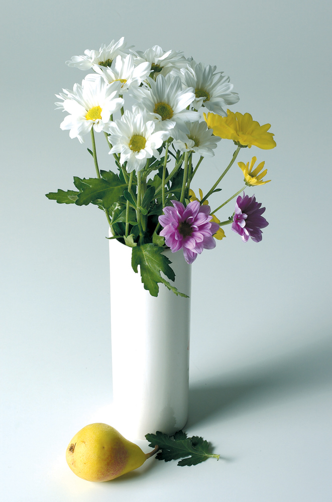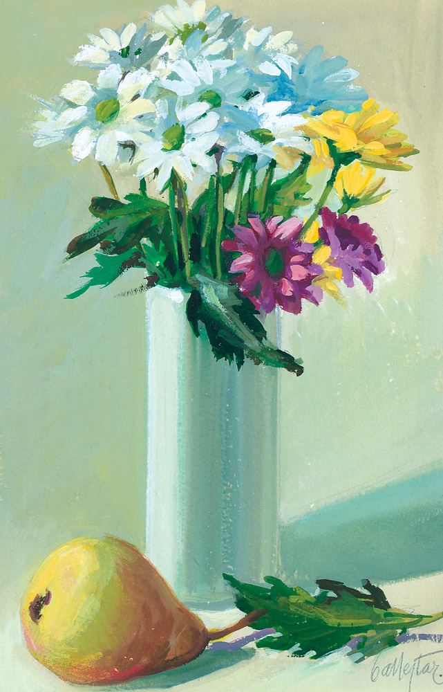 Las flores son una fuente inagotable de inspiración para todo artista, tanto para el que se inicia en la pintura como para el experto profesional. Este bodegón es muy sencillo, sin embargo, se ha procurado componer un ramo de flores con cierto ritmo, jugando con los colores, que crean una curva entre el blanco, el amarillo y el rosa y, por último, con la posición de la pera en la base del jarrón.
