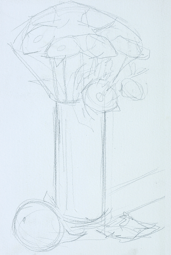 • Con lápiz se encajan las flores y el resto de elementos que intervienen en el cuadro; como las formas elementales son casi geométricas, ello facilitará este dibujo previo.