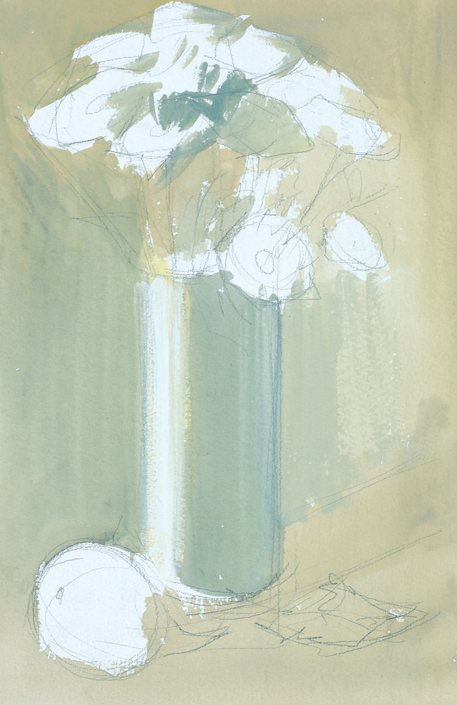 • Para que el motivo principal destaque y los blancos adquieran una importancia especial, se empieza pintando el fondo con un tono agrisado con ocre, cobalto y blanco.
