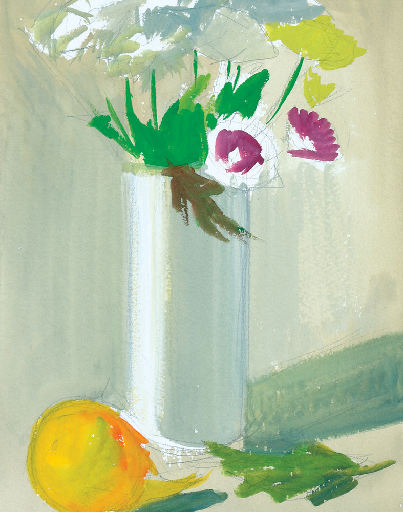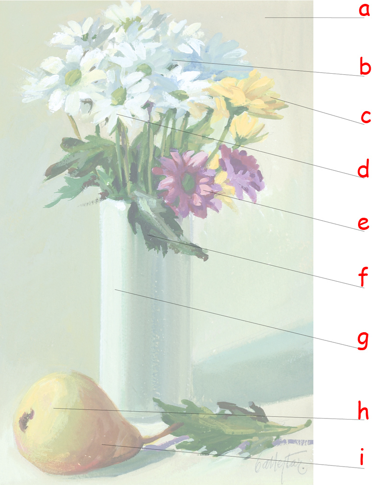 a. El fondo se pinta con un tono grisáceo que recorta la forma de las flores. b. Se mancha con gris en las flores blancas para recortar los puntos de luz más luminosos. c. Las flores amarillas se inician con un manchado amarillo verdoso. d. Los pétalos en las flores blancas se realizan con diversas tonalidades de blanco. e. Las flores de color rosa se realizan con diversas tonalidades superpuestas. f. El perfilado de las hojas se realiza en último lugar. g. Con un color como el del fondo pero más aguado se pinta en el lado izquierdo del jarrón. Después se repasa con una pincelada húmeda y limpia. h. El punto más luminoso de la pera se pinta con amarillo verdoso. i. Con un tono anaranjado se pinta en la zona oscura de la pera. |