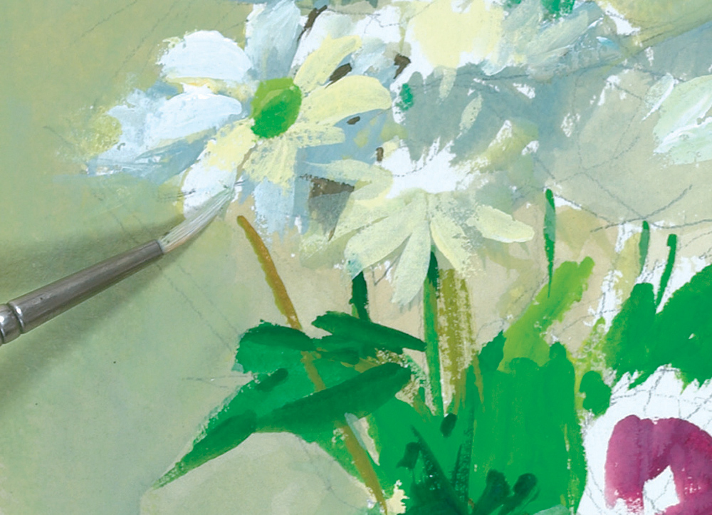 • Con amarillo verdoso se pinta la base de las flores amarillas y con gris en las flores blancas, recortando las zonas destinadas a los pétalos más luminosos.
