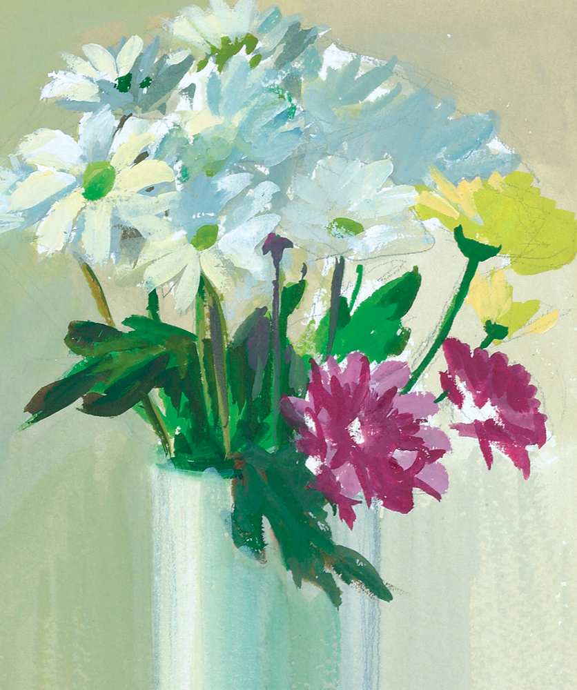 • Con un verde algo más oscuro se perfila la forma de los tallos y algunas hojas, y también se mancha ligeramente en el centro de la flor blanca de la izquierda.