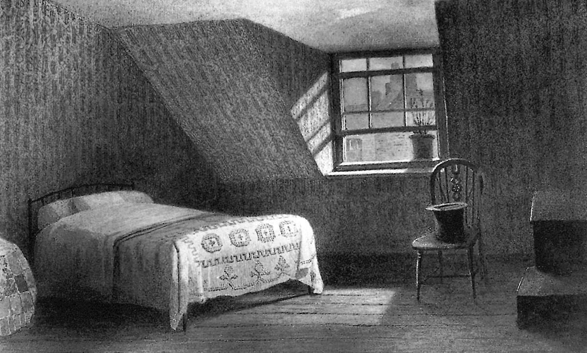 3. J.W. Archer, Le Grenier de la maison des Turner à Maiden Lane, Covent Garden, considéré comme étant le premier atelier de Turner, 1852, aquarelle, British Museum, Londres.