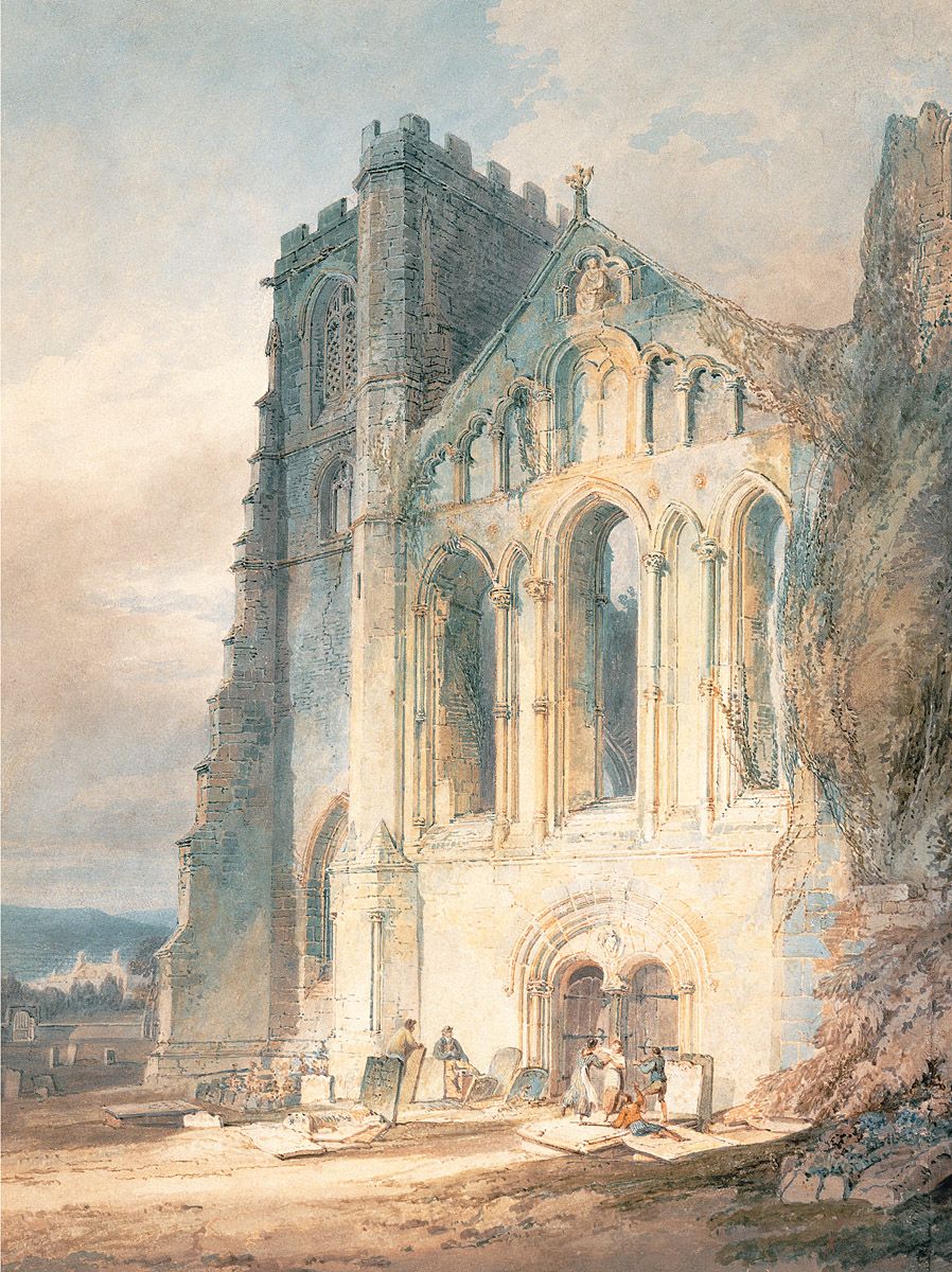 7. J.M.W. Turner, Cathédrale de Llandaff, Sud du Pays de Galles, RA 1796, aquarelle, 35,7 x 25,8 cm, British Museum, Londres. Avec ces enfants dansant sur des tombes – inconscients du fait qu’un jour ils occuperont aussi des tombeaux semblables ce dessin est peut-être le premier paysage moral de Turner.