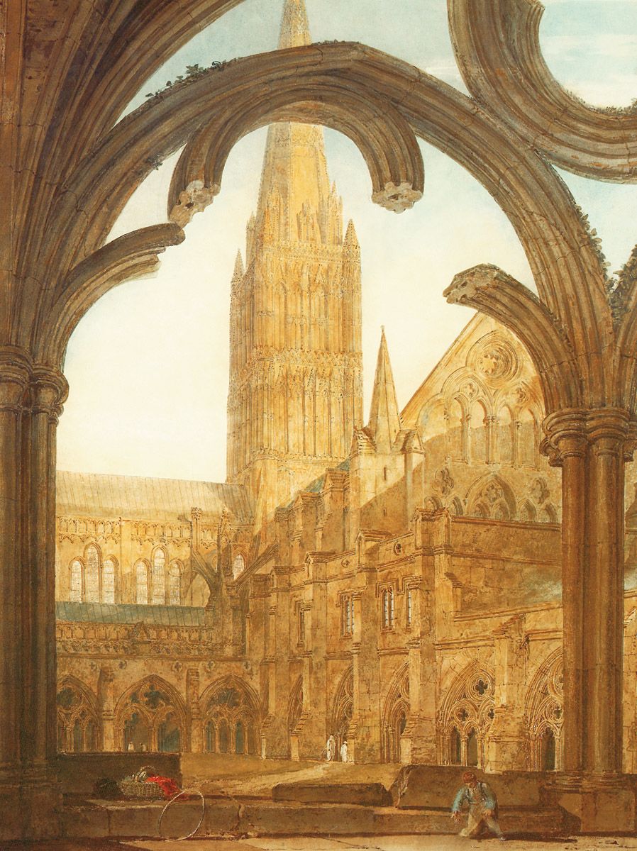 8. J.M.W. Turner, Vue sud depuis le cloître, Cathédrale de Salisbury, vers 1802, aquarelle, 68 x 49,6 cm, Victoria and Albert Museum, Londres. Ce dessin provient de la série des nombreuses vues de la cathédrale réalisée pour Sir Richard Colt Hoare.