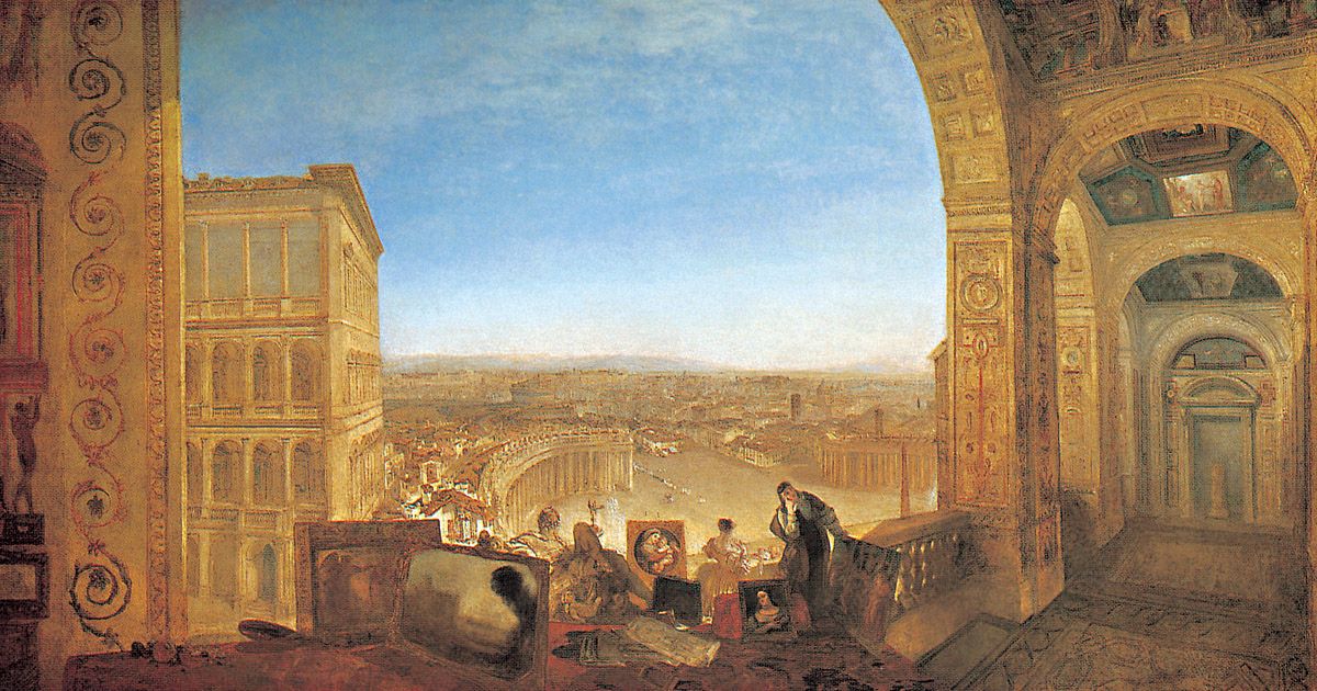 13. J.M.W. Turner, Rome, depuis le Vatican. Raphaël, accompagné par La Fornarina, prépare ses tableaux pour la décoration des Loges, RA 1820, huile sur toile, 177 x 335,5 cm, Turner Bequest, Tate Britain, Londres.
