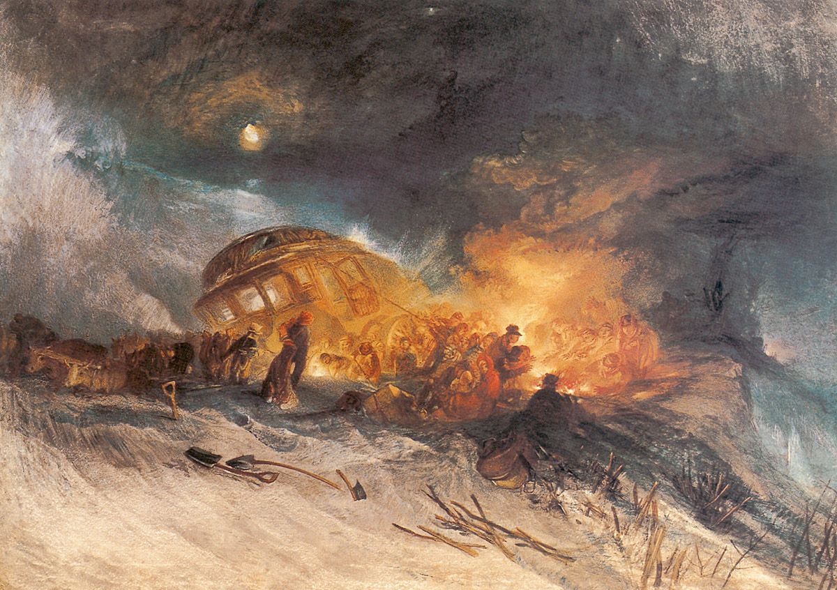 18. J.M.W. Turner, Messieurs les voyageurs à leur retour d’Italie (par la diligence) sous une rafale de neige au mont Tarrar – 22 janvier 1829, RA 1829, aquarelle, 54,5 x 74,7 cm, British Museum, Londres.