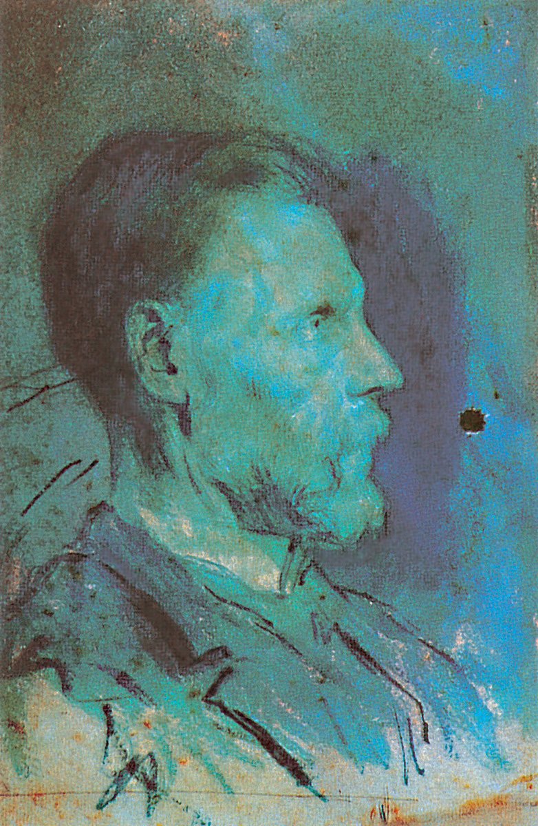 Benito Soler Vidal war ein Modeschneider in Barcelona, Freund und Mäzen der Künstler, die im Kabarett „Els Quatre Gats“ zusammenkamen, und wahrscheinlich derjenige, der in dieser Gesellschaft den Typ des vollkommenen Dandy repräsentierte. Als solch einen melancholischen Dandy hat Picasso ihn auch dargestellt, indem er die ganze mystische Tiefe des unergründlichen Blaus ausnutzte, um den Porträtierten aus seinen Alltagsverhältnissen in jene anderen zu übertragen, die viel besser zu seinem edlen Äußeren passen. Er umgab Soler mit einer kosmischen Nacht, indem er sein schmales Gesicht jenem blassen Himmelskörper ähnlich machte, der kaum von lebendigen Farben berührt ist. Der artistische Wille Picassos hat hier augenscheinlich die Oberhand über die wirkliche Psychologie des Modells gewonnen. Das Porträt von Soler ist aber auch dadurch gekennzeichnet, dass es das Bestreben des Malers deutlich macht, einen körperlichen Typ zu finden, der geistige Sensibilität ausdrückt. Und hier leitet das Ermitage-Porträt zu den zweifellosen Meisterwerken des Herbstes 1903 über, wovon eines der Alte Jude mit einem Knaben ist.
