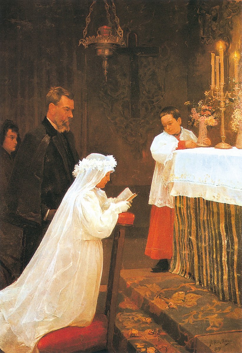 Und doch brachte die für ihn vom Vater gemietete Werkstatt (mit 14 Jahren!), die ihm eine verhältnismäßige Emanzipation sowohl von der Schule als auch von dem engen Kreis der Familie erlaubte, eine reelle Unterstützung seiner Selbständigkeit. „Ein Studio ist für einen jungen Mann, der mit überschäumendem Ungestüm seine Berufung fühlt“, schreibt Josep Palau i Fabre, „fast wie eine erste Liebe: Alle Illusionen zentrieren und kristallisieren sich dort.“[11] Und hier zog Picasso die Bilanz seiner Schuljahre, indem er die ersten großen Gemälde malte: Die erste hl. Kommunion (Winter 1895-1896) — eine Komposition im Interieur mit Figuren, Drapierungen und Stillleben, mit schönen Lichteffekten — und Ciencia y Caridad (Anfang 1897) — ein riesengroßes Gemälde mit Figuren größer als das Modell, eine Art reale Allegorie. Das letzte erhielt eine Ehrenurkunde auf der nationalen künstlerischen Ausstellung in Madrid und eine Goldmedaille auf der Ausstellung in Malaga.