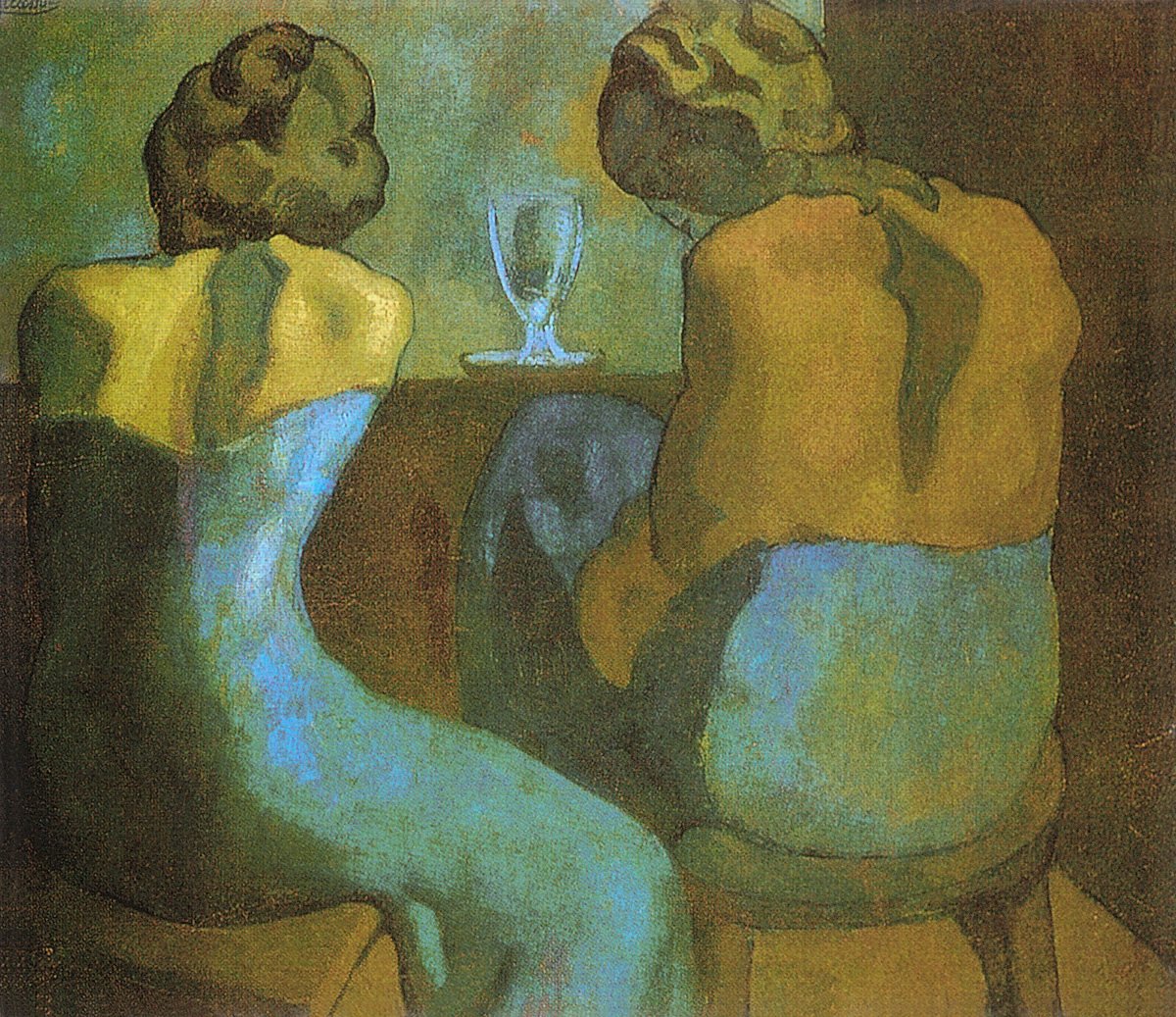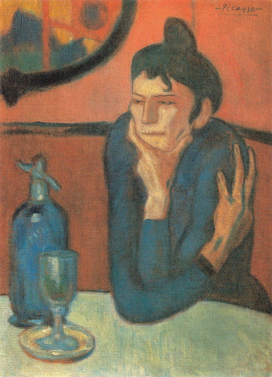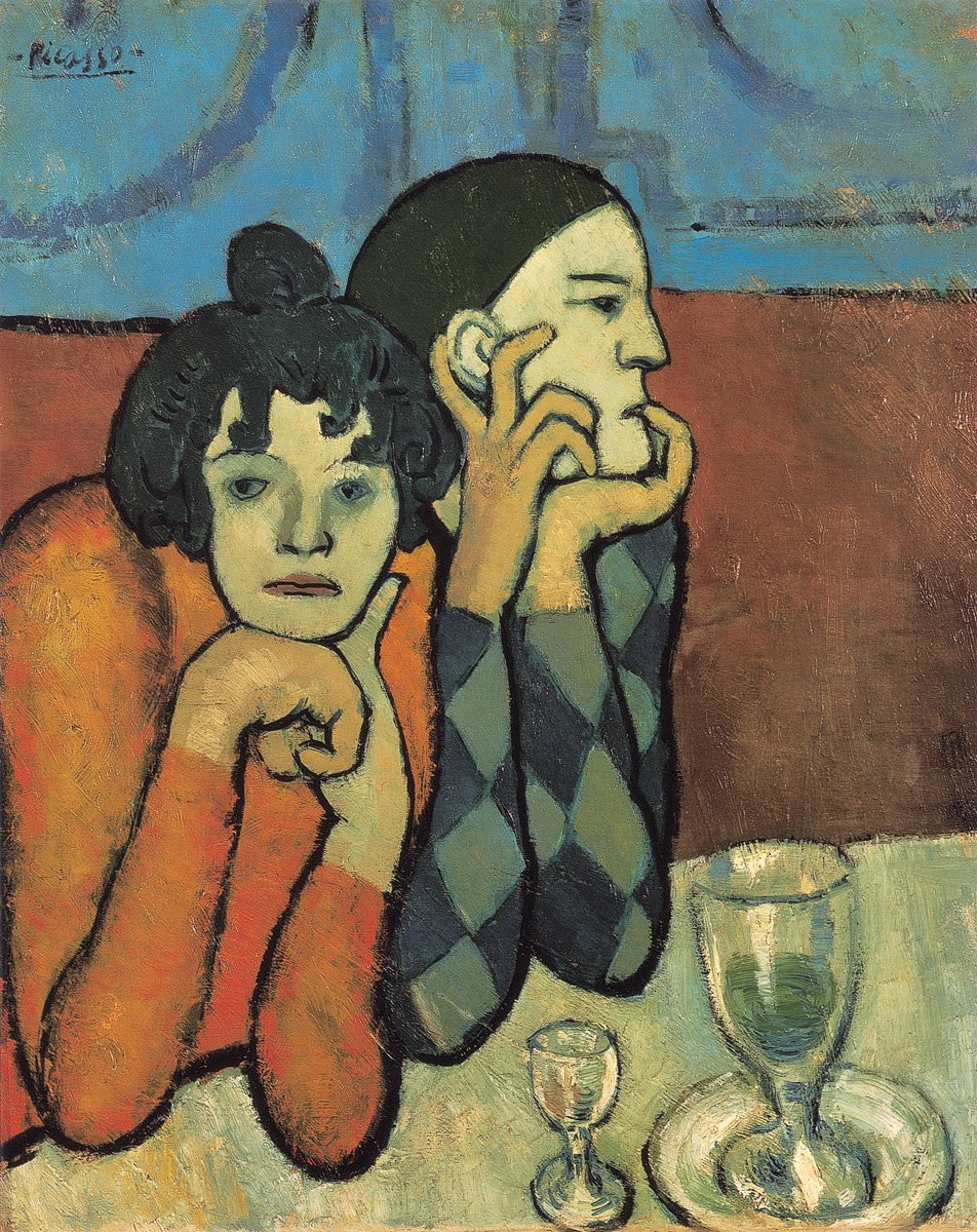 In formaler Hinsicht setzen Harlekin und seine Gefährtin und die Absinthtrinkerin die Linie Gauguins fort, in emotionaler Hinsicht eher diejenige van Goghs, der das Nachtcafé in Arles malte, das er als einen schrecklichen Ort empfand, „einen Ort, an dem man umkommen, verrückt werden, ein Verbrechen begehen kann“.[32] Verallgemeinernd kann man sagen, dass zu dieser Zeit die Form in der Komposition vorherrscht und die Themen einen sentimentalen Charakter haben, nach Daix zwei der drei Grundlagen jener neuen Kunst, die bei Picasso während der zweiten Hälfte des Jahres 1901 ausreifte.[33] Das dritte Element — die blaue Monochromie — gab dieser neuen Richtung Picassos ihren Namen: die Blaue Periode, die Ende 1901 einsetzte und bis zum Ende des Jahres 1904 fortdauerte.