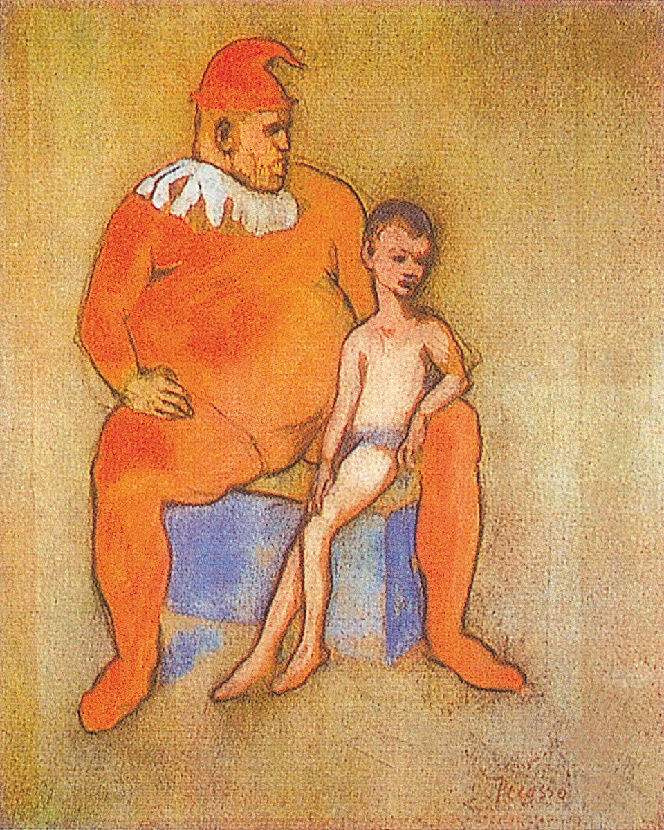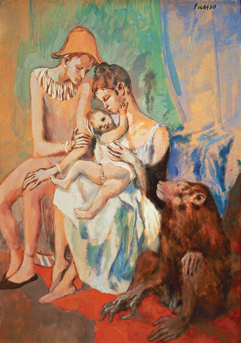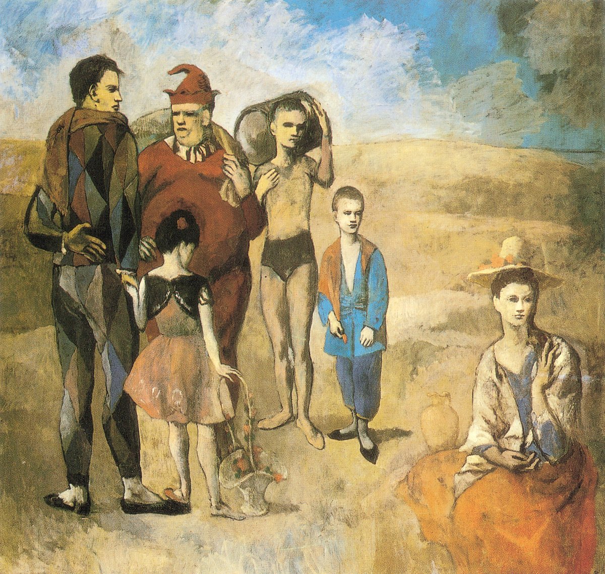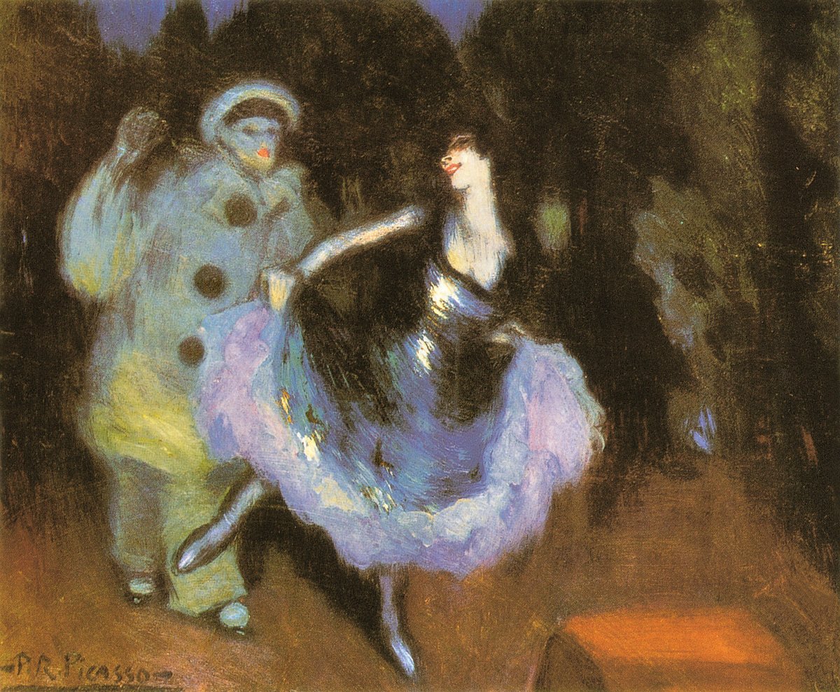 Einige der zeitgenössischen Forscher[31] sehen in diesen frühen Gestalten der italienischen Komödie bei Picasso eine Analogie zur symbolischen Poesie des späten Verlains. Etwas weiter gefasst: Man kann feststellen, dass Picasso sich jetzt durch poetische Mittel ausdrückt; das Auge liest das Bild wie ein Gedicht, indem es sich in die Emotionen und die symbolischen Assoziationen der Farbe versenkt, den Sinn der gegenständlichen Verbindungen begreift und sich vom Spiel der sich reimenden Linien bezaubern lässt, die, wie auch die Farben des Gemäldes mit erregender Musikalität ausgestattet und von der Prosaik eines Genrebildes befreit sind.
