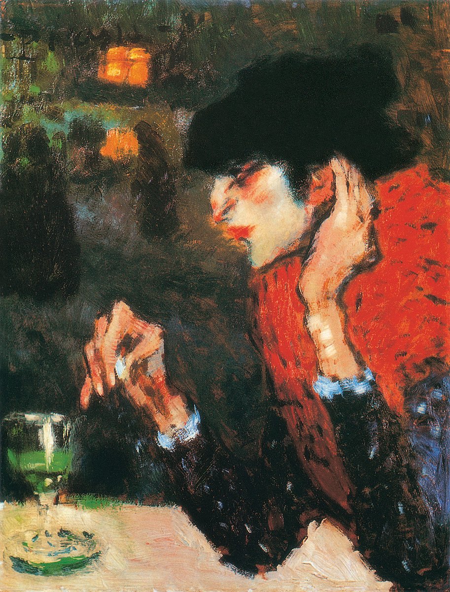 Kein Zufall aber ist das vor dem Harlekin auf dem Tisch stehende, nicht zu Ende getrunkene große Glas Absinth, bitterer Wermutlikör von grell-grüner Farbe, Allegorie der Bitterkeit des Lebens, die zusätzlich von der Verfluchung des Harlekin-Malers spricht. Das Bild des „verfluchten Poeten“ (hier auch des Malers) war in jener Epoche für Picasso akut. Es floss in eins zusammen mit seinem Ideal der wahren Kunst, mit Paris, mit seiner Gegenwart, seinem eigenen Leben. Der „Fluch“ Baudelaires, Verlains, Rimbauds, Gauguins, van Goghs, Lautrecs war unabdingbar mit dem Bohèmeleben und dem Alkohol verbunden. Bereits in diesem frühen Gemälde hat Picasso die Bedeutung des Alkohols als Mittel zum Unterlaufen der banalen alltäglichen Wirklichkeit durch eine andere, innere, spirituelle Wirklichkeit erkannt, ebenso wie eine Gleichstellung der Kunst und Poesie der „verfluchten“ Artisten mit dem verbrennenden Alkohol (Alcools nannte im Jahre 1913 der Picasso geistig nahestehende Apollinaire seinen ersten Gedichtband), als Elixier der Weisheit, aber auch der verhängnisvollen Melancholie…