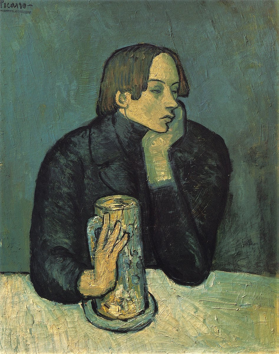 So empfand ihn der Maler, als er, verspätet zum vereinbarten Treff kommend, den Freund in einer melancholischen Erwartung in einem Café hinter einem Bierglas vorfindet. „Mit einem Blick erfasste er, bevor ich ihn bemerkte, meine Pose. Dann reichte er mir die Hand, setzte sich, und wir kamen ins Gespräch“, erzählte Sabartés nach mehr als vierzig Jahren in seinem Buch Picasso, Porträts und Erinnerungen.[38] Das Bildnis wurde in Abwesenheit des Modells gemalt, nach dem Gedächtnis, oder präziser, nach einer Art innerem Modell im Bewusstsein des Malers, das den Eindruck des Treffens in sich bewahrt hatte. Dieses Modell, die Figur im Café, ist gleichsam die Exposition einer malerischen Erzählung. Es ist diesmal eine Erzählung von der Einsamkeit des Dichters, eines Träumers mit kurzsichtigen Augen. Seinem melancholischem Temperament und, wie es scheint, seiner Neigung zum nördlichen Symbolismus (der in Barcelona hochgeschätzt war) ist ein großer Bierkrug als Attribut zugeordnett und nicht ein Glas scharfen Branntweins.