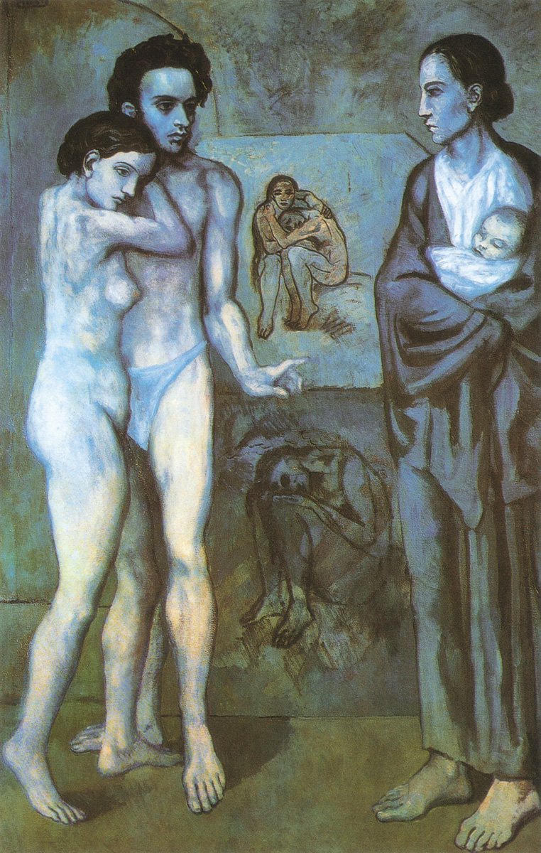 Als er sich in Barcelona wieder an die Ölmalerei macht, kommt ihm seine neue graphische Erfahrung zugute. Er verwendet größere Aufmerksamkeit auf die Probleme des Raumes, der menschlichen Anatomie, der Konkretheit der Objekte, deren Kreis sich im Vergleich zum Jahr 1902 wesentlich erweitert. In den bedeutendsten Gemälden der ersten Hälfte des Jahres 1903 — Arme Leute am Meeresstrand oder die Tragödie (Z. 1. 208), Rendez-vous und Das Leben — werden für die Blaue Periode universale Motive der Welttrauer und des ewig Weiblichen zu Szenen von Wechselbeziehungen zwischen individualisierten Personen — Männern, Frauen, Kindern. So drückt Picasso seine seelischen Erfahrungen in diesen Bildern gleichsam als symbolisch-mythologische blaue Träume aus, die die modernen Forscher zu psychoanalytischen Deutungen veranlassen.[43]