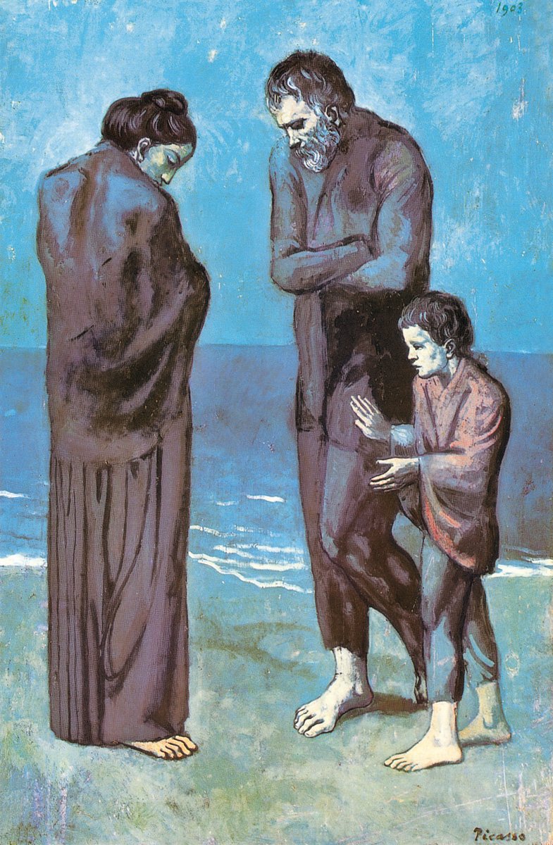 Das Thema des menschlichen Elends, das in der Abbildung von Armut und körperlicher Behinderung, von Alter, Blindheit, Hunger und Obdachlosigkeit dramatisiert ist, wird durch den Kontakt mit der Realität noch weiter konkretisiert. Von vielen Autoren wurde bemerkt, dass der Anblick von bettelarmen Vagabunden und Krüppeln keine Seltenheit für die Barcelonaer Straßen zu Anfang des Jahrhunderts war und dass von einem Kollegen Picassos, dem Maler Nonell, bereits ähnliche Sujets mit dem düsteren Kolorit des „schwarzen Spanien“ benutzt worden waren. Doch Picasso greift „wieder eine Note höher, als es in der Partitur steht“: Die körperlichen Schwächen interessieren ihn nur als Metapher der Geistigkeit, die durch das Leid verschärft ist. Während das von Picasso während des Pariser Winters 1902/1903 aus seiner Phantasie geborene „Sisyphusgeschlecht“ von untersetzten, dorischen Proportionen war, so führt ihn im Barcelona des Herbstes 1903 der Trend zu reinen und gedehnten Linien (indem sich Picasso ihrem musikalischen Spiel hingibt, bedeckt er planlos Blatt um Blatt mit Skizzen von nackten Körpern, Gesten, Posen, Profilen), manieristisch langgezogenen Figuren, die die Forscher an El Greco, Morales, an den Graphismus romanischer Fresken und der Reliefs Kataloniens erinnern.