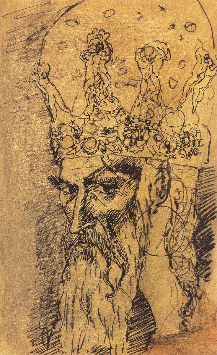 Greisenkopf mit Krone (Der König), 1905. Aquarell, Tusche, Feder auf Papier, 17 x 10 cm. Puschkin-Museum der bildenden Künste, Moskau.