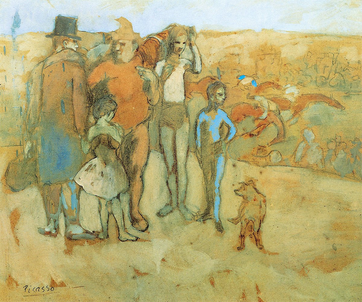 Aber nicht dem mystischen Ruf Zolas folgend (wie sich Anatole France über Steinlen äußerte), nicht aus Neigung zu einer originellen Lebensweise und auch nicht mit dem Auge eines Satirikers beginnt der junge Picasso seine sogenannte Kabarettperiode. In diesem Thema sieht er die Möglichkeit, das Leben als Drama darzustellen und als dessen Kern den Ruf des Geschlechts. Jedoch erinnern die Unumwundenheit, die Expression und der sparsame Realismus der Auslegung dieser Sujets weniger an die französischen Einflüsse als vielmehr an die Eindrücke, die die späten Werke Goyas auf den jungen Picasso ausgeübt hatten (siehe Bilder wie Der 3. Mai 1808).