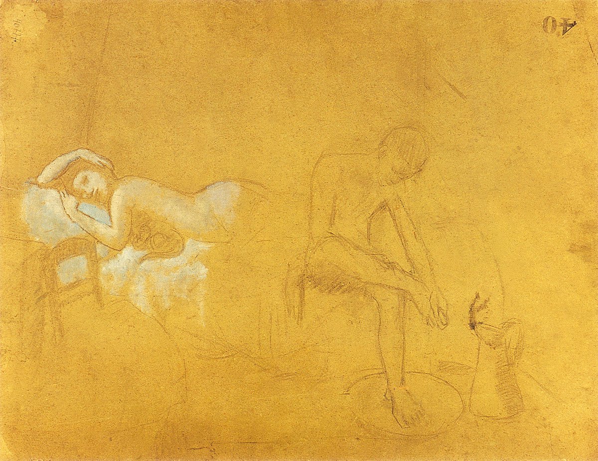 Die Entstehung dieser plastischen Idee wird auch in den Pariser Arbeiten der zweiten Hälfte des Jahres 1901 deutlich, in denen die Figuren aussehen, als seien sie in die Umrisse eines romanischen Rundbogens gesetzt. Es handelt sich um die Zyklen der weiblichen Gefangenen und madonnenähnlichen Schwangeren (wie sie Daix bezeichnete), in denen sich eigenartig die Eindrücke Picassos von seinen Besuchen im Herbst 1901 im Pariser Frauengefängnis Saint-Lazare widerspiegelten. Die Entwicklung all dieser Elemente, sowohl der plastischen als auch der sinnlichen, bildet gleichsam die Vorgeschichte der Ermitage-Begegnung.