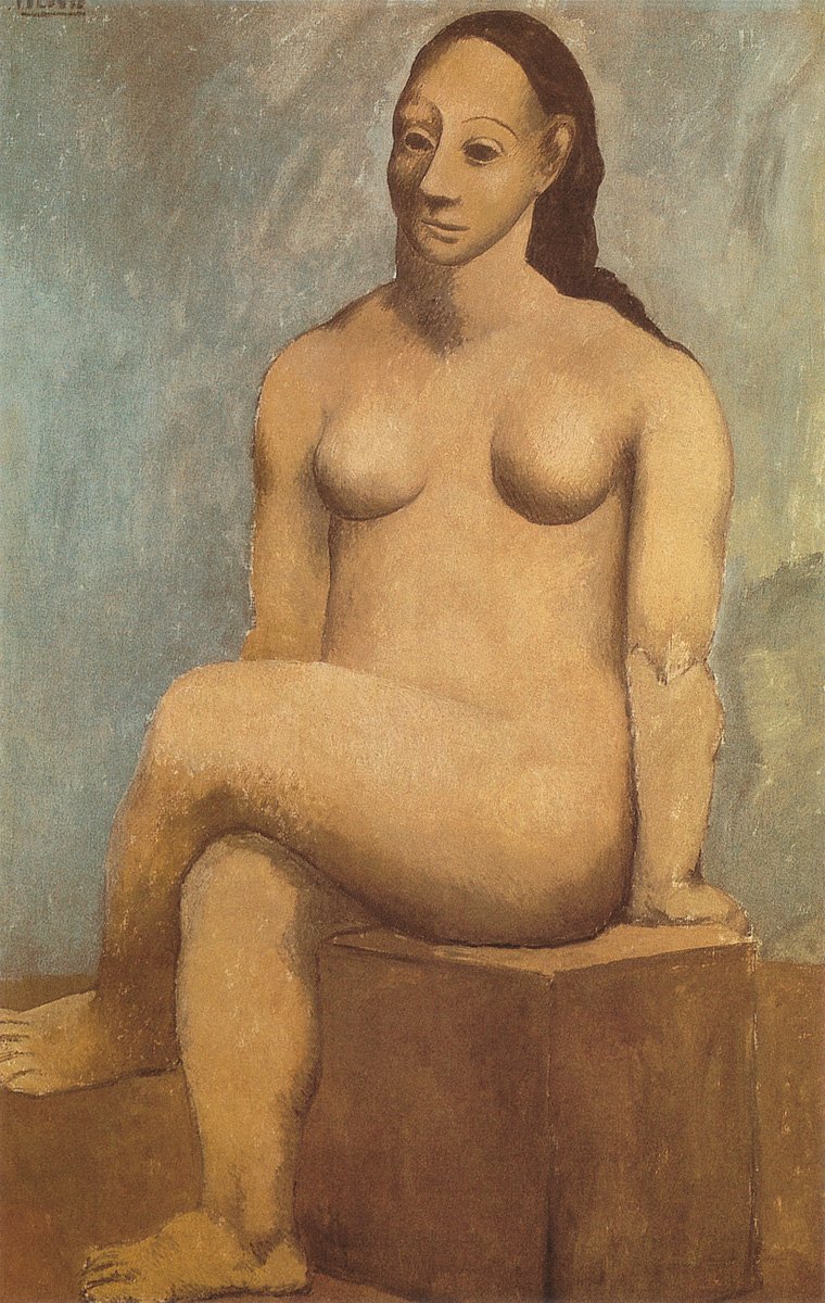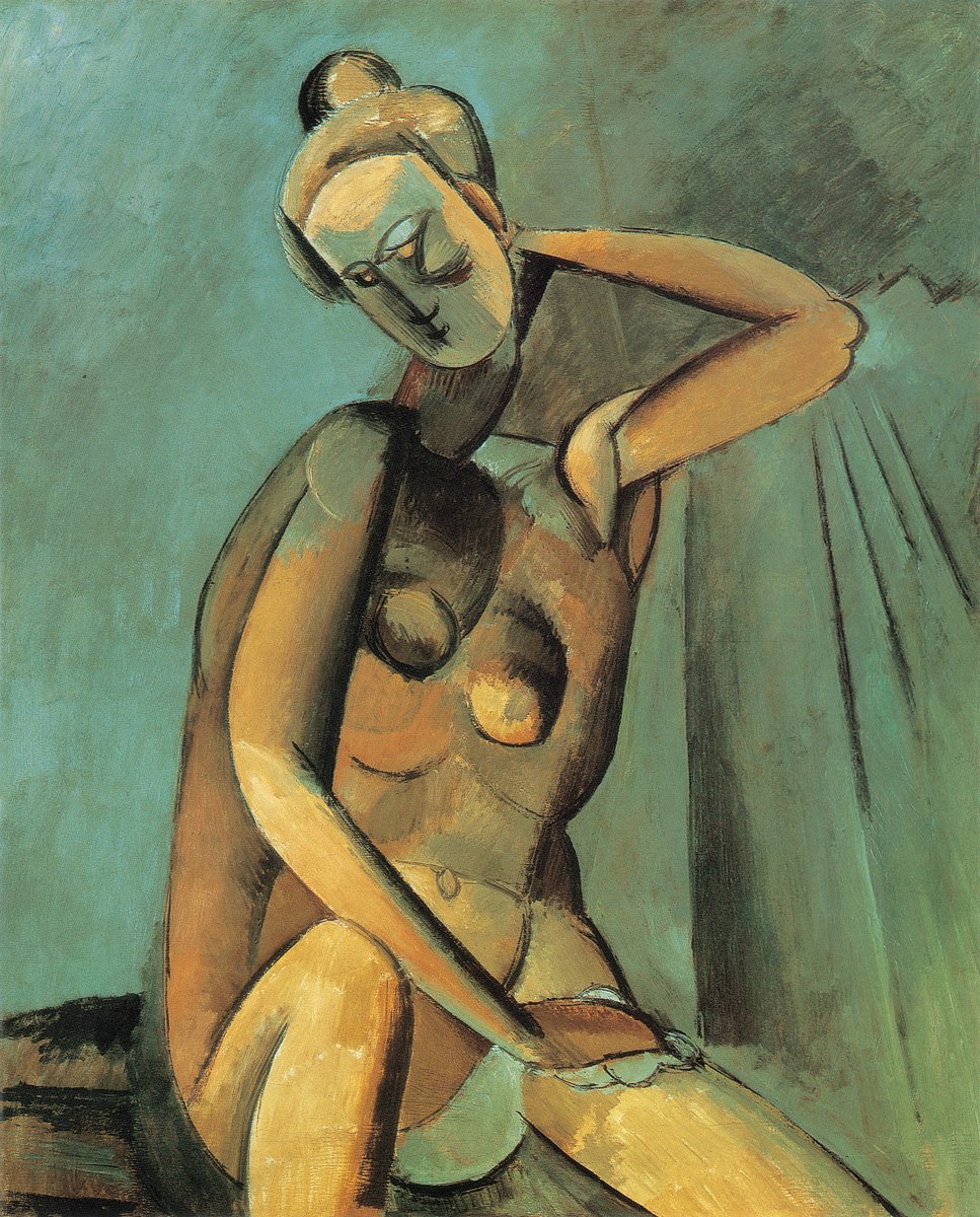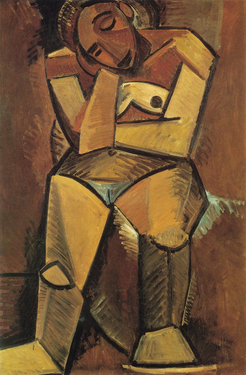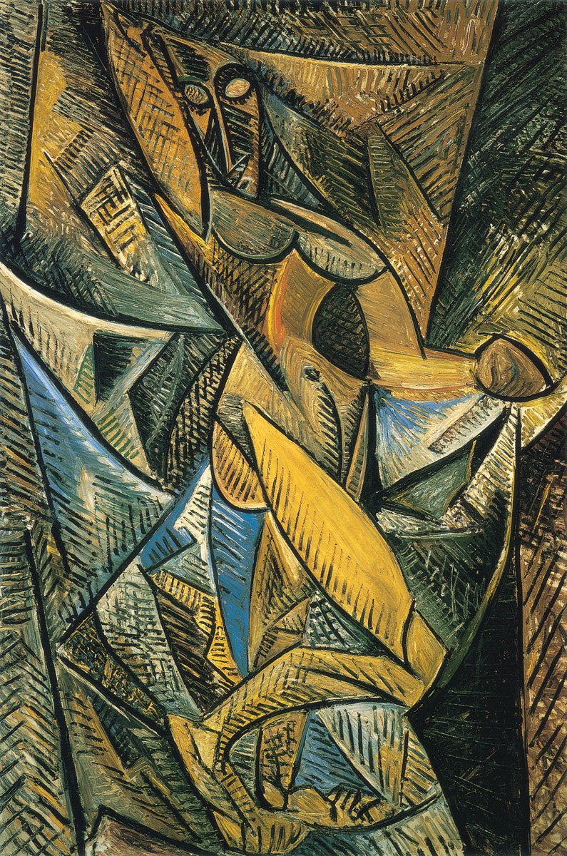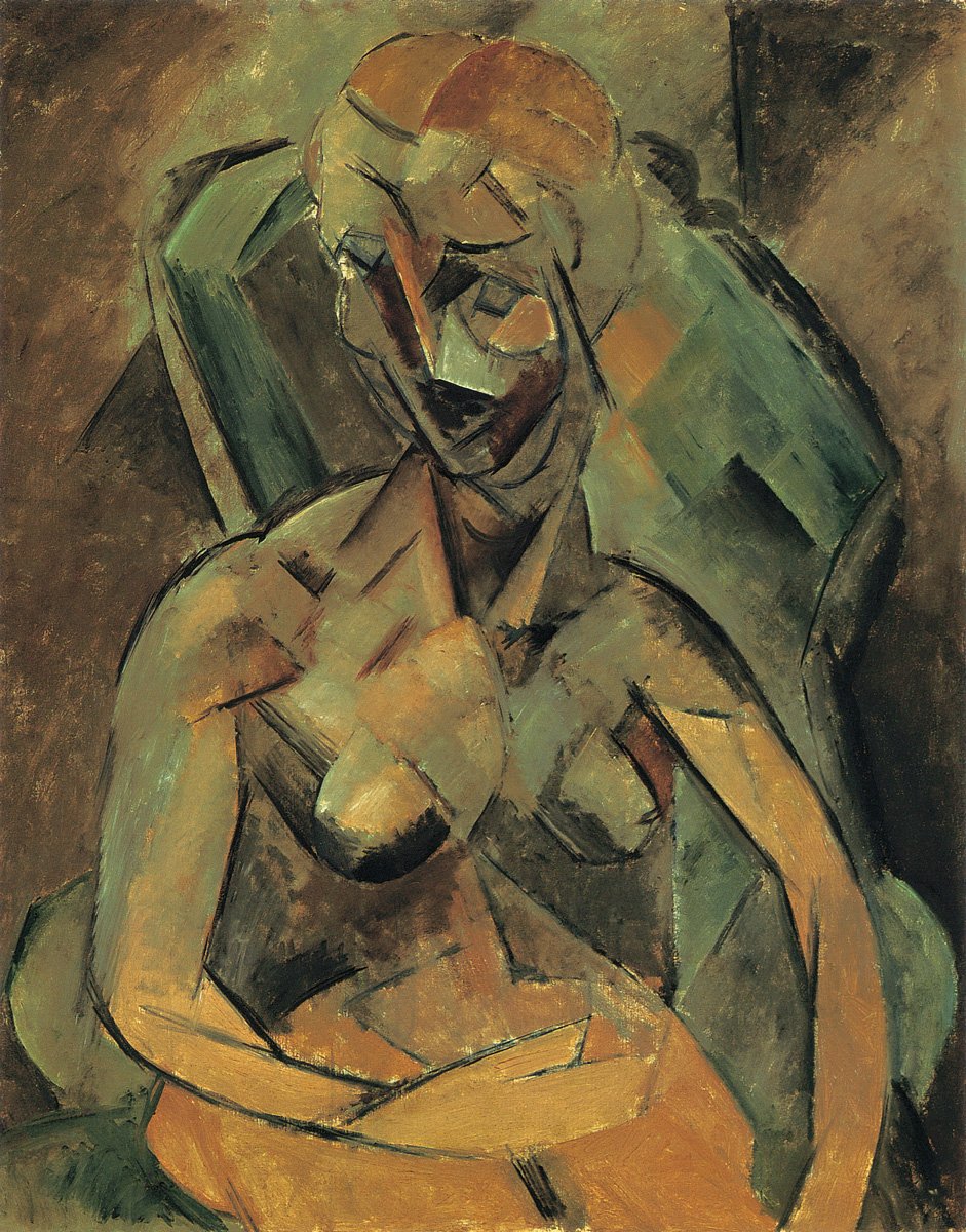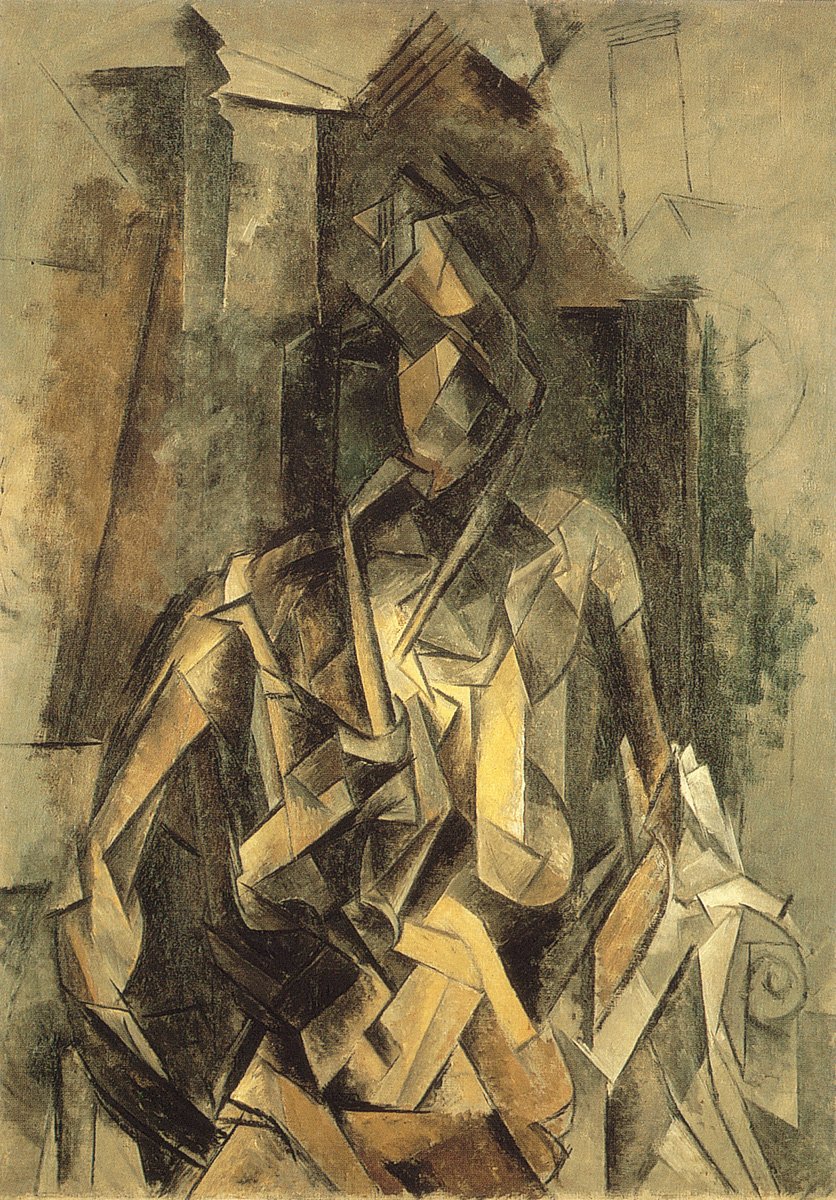 An die intellektuelle Atmosphäre der Arbeit im Atelier erinnert vor allem die Junge Dame, die im Winter 1909 geschaffen wurde. Zu dieser Zeit übersiedelte Picasso aus dem elenden „Bateau-Lavoir“ in eine komfortable Atelierwohnung am Boulevard de Clichy, am Fuße des Montmartre-Hügels. Das große, nach Norden hinausgehende Fenster des Ateliers bot das gleiche silbrige Licht, das Corot und Cézanne so liebten, daher zum Teil jener unerwartete Geschmack am Valeur, der in dem Ermitage-Bild zu sehen ist. Diese farbige Malweise beseelt die ganz und gar untraditionelle Lösung der Entblößten im Sessel, die eher ein frauenähnlicher Kristallleib ist, der auf den ersten Blick durch seine „Deformationen“ überrascht. Picasso malt diese Bilder, indem er dicht an die Leinwand heranrückt; er entfernt sich nicht, um den allgemeinen Effekt, der ihn nicht interessiert, zu beurteilen. Seine Arbeit ist weniger dekorativ als psychologisch. Sehr einfühlsam bemerkte der russische Kritiker Innokenti Aksjonow: „Picasso fixiert seine Gegenstände so nah, wie man das Gesicht einer Geliebten betrachtet. Um zwei Gegenstände gleichzeitig zu sehen, muss er den Kopf wenden, und auf seiner Leinwand trägt er die Breite der Komposition in die Tiefe.“[97] Daraus entstehen bei Picasso, dem „Maler aus Berufung, dem Erneuerer der Natur, dem Widerspruchsgeist“ (Sabartés), solche Deformationen, mit denen er gleichsam sagt, dass es keine schönen Gegenstände gibt, sondern nur die Kunst (Aksjonow).