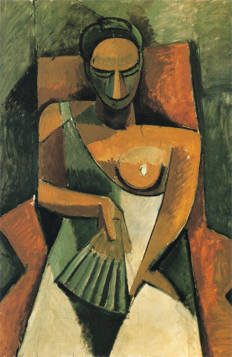 Eine elegante Dame aus einer ganz anderen Epoche stellt die Dame mit Fächer dar, in der einige Zeitgenossen Picassos das Porträt einer amerikanischen Kunstliebhaberin erkannten. Die Ähnlichkeit war übrigens eine zufällige, obwohl etwas von einem Galaporträt im Gemälde durchscheint. Die elegante Dame mit dem keck auf dem Kopf sitzenden Hut und dem in Falten liegenden Jabot, mit dem gehobenen, geöffneten Fächer in der einen Hand und dem gesenkten, zusammengeklappten Regenschirm in der anderen, posiert in einem Sessel. Das Neue der malerischen Sprache dieses Gemäldes besteht offensichtlich darin, dass hier alle formalen Lösungen zu einer wunderbaren Einheit zusammengeführt sind, die uns das Nichtorthodoxe der Ausführungsweise vergessen und nur die Gestalt, ihren individuellen Ausdruck wahrnehmen lässt.