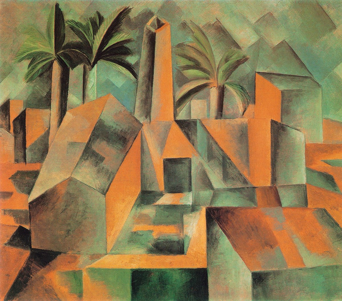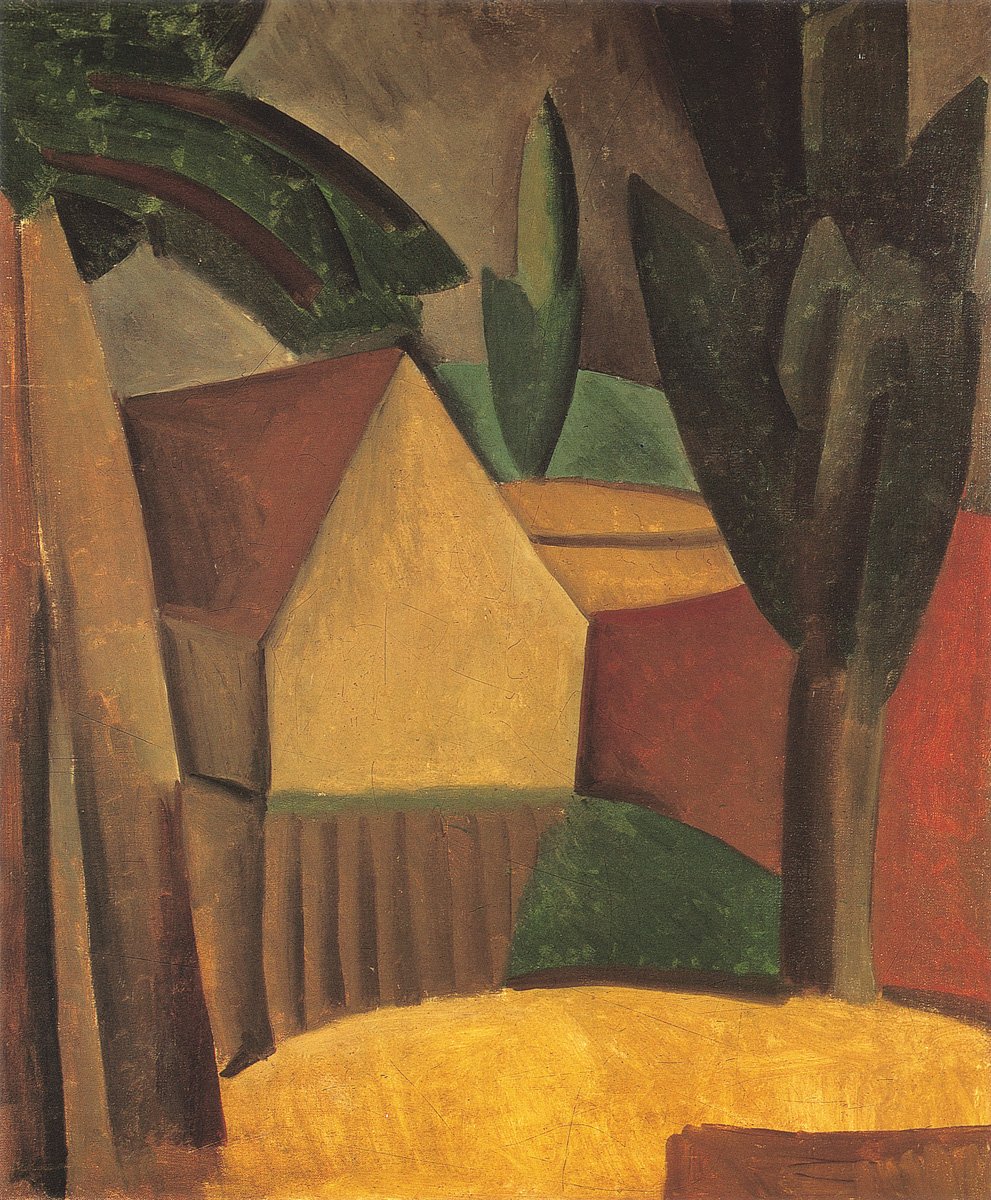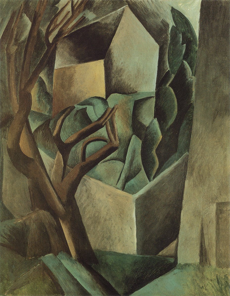 Eine dieser Kräfte ist die elementare Naturkraft mit ihrem ungestümen Wuchern der grünen Laubhütten und der pathetischen Gestikulation des trockenen Baumes, die andere ist die sinnlich geordnete Kraft mit den blinden Mauern und schneidenden Flächen der geometrischen Strukturen. Diese Dramatik, der die streng zurückhaltenden Beziehungen der kalten Mineralfarben und die Gespanntheit der auf der Spitze balancierenden Komposition dienen, überwindet die „Untätigkeit“ der reinen Landschaft, als erklänge hier der Widerhall von Konflikten der belebten Welt. Dieser Eindruck entspricht dem ursprünglichen Vorhaben Picassos, dieses Stück Natur zu dem Hintergrund einer Sujetkomposition mit Figuren zu machen, die er im Winter und Frühling 1909 beabsichtigte.