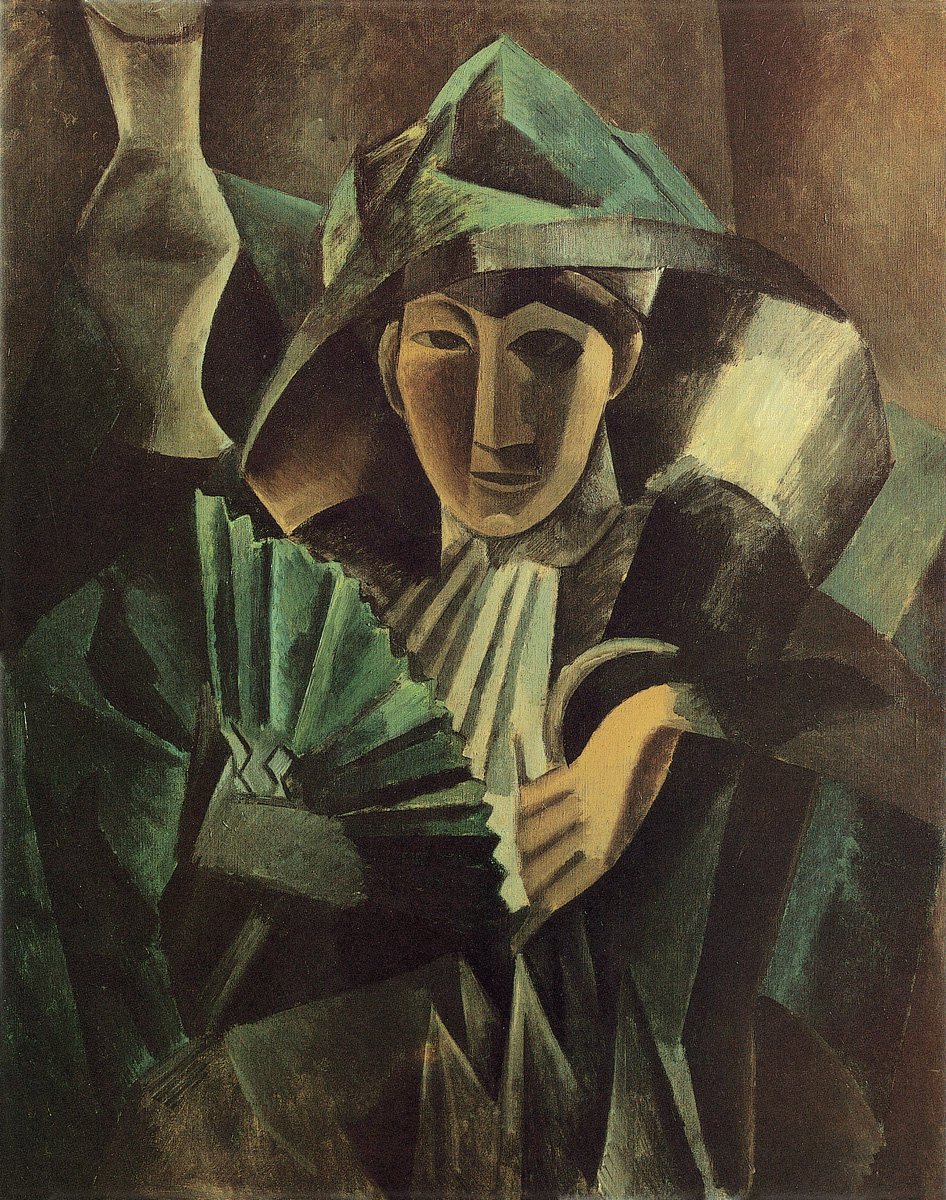 Während jedoch bei der weiblichen Harlekin-Isabeau der auf die Hand gesenkte Kopf, der niedergeschlagene Blick und die pseudohistorischen Gegenstände das Bild einer Königin aus einem romantischen Traum zeichneten, eines herrlichen Ungeheuers (Tschulkow), verhält es sich ganz anders mit der Dame mit Fächer: Zwei verschiedene Gesichtsausdrücke, für jede Hälfte der Maske ein anderer, in Verbindung mit der manierierten Haltung einer Städterin und der winkligen, beinahe knisternden Rhythmik ohne jede Plastizität, formen nicht ein Bild des ewig Weiblichen, sondern eine Art von Kleiderpuppe, die kein anderes Wesen als den äußeren Schein besitzt. Und während die Weiblichkeit der Königin Isabeau durch die Fülle der pflanzlichen Anspielungen (Laubmuster, die mit Früchten gefüllte Kompottschale, das smaragdene Grün des Kolorits) betont und „metaphorisiert“ wurde, ist hier das Attribut, das bildhaft die Dame mit Fächer charakterisiert, eine flüchtig umrissene leere Blumenvase.